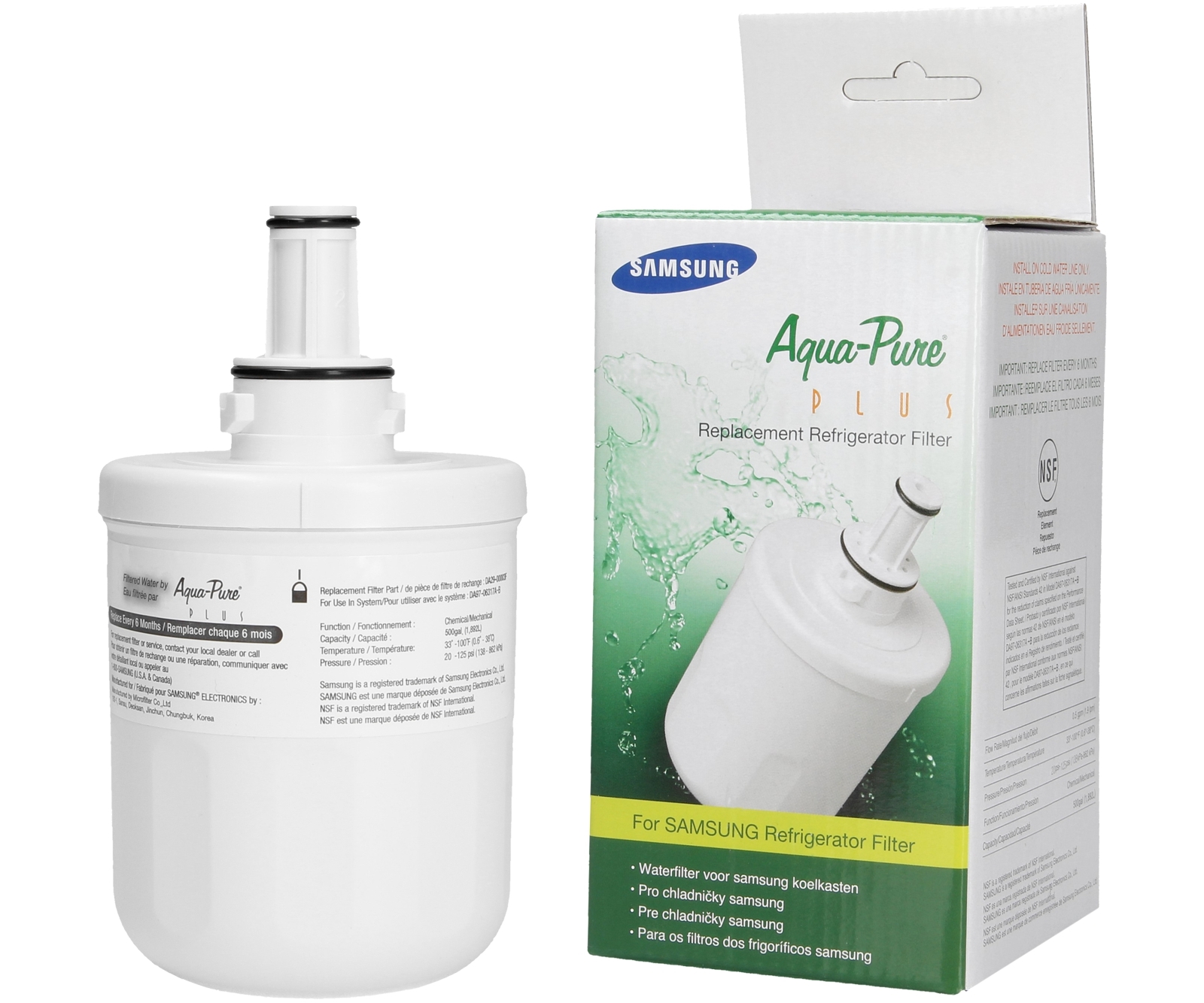 Фільтр Samsung Aqua-Pure зупиняє забруднення що з водопроводом вони проходять по трубах. Фільтр для води Samsung зменшує запахи, небажаний смак, видаляє з води хлор і хімічні забруднення. Забезпечує дезінфекцію та захист від хвороботворних бактерій.
