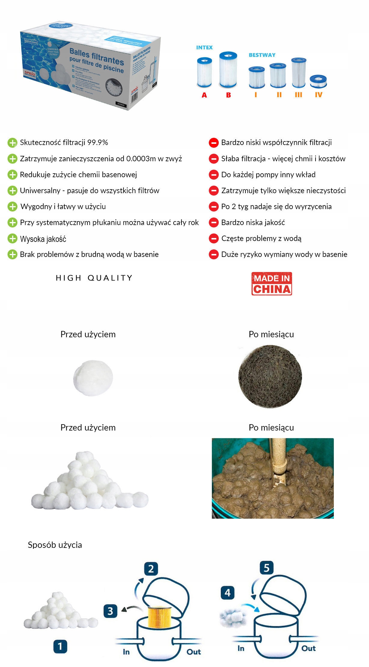 Спосіб застосування: кульки AQUALOON необхідно розташувати вільно, не розминаючи, замість наявного фільтра (піску), увімкнути та використовувати фільтруючий насос у звичайний спосіб. Завдяки своєму білому кольору вони є відмінним індикатором забруднення, а отже, і якості процесу фільтрації. Наскільки вони брудні, видно з першого погляду. Коли AQUALOON забрудниться, просто промийте ліжко під сильним струменем води, виперіть його вручну або навіть у пральній машині, помістивши кульки в сітку. Після прання помістіть його назад у насос. Рекомендується перевіряти стан куль приблизно кожні 4 тижні. При такому використанні AQUALOON легко прослужить 5-7 років, залежно від розміру басейну та ступеня забруднення фільтра, забезпечуючи кришталево чисту воду. Найкраще те, що вам доведеться промивати систему фільтрів басейну лише чотири рази на рік, а не чотири рази на місяць! З екологічної точки зору, це чудова новина для нашого водоносного горизонту, а також для нашого гаманця під час оплати рахунків за воду!