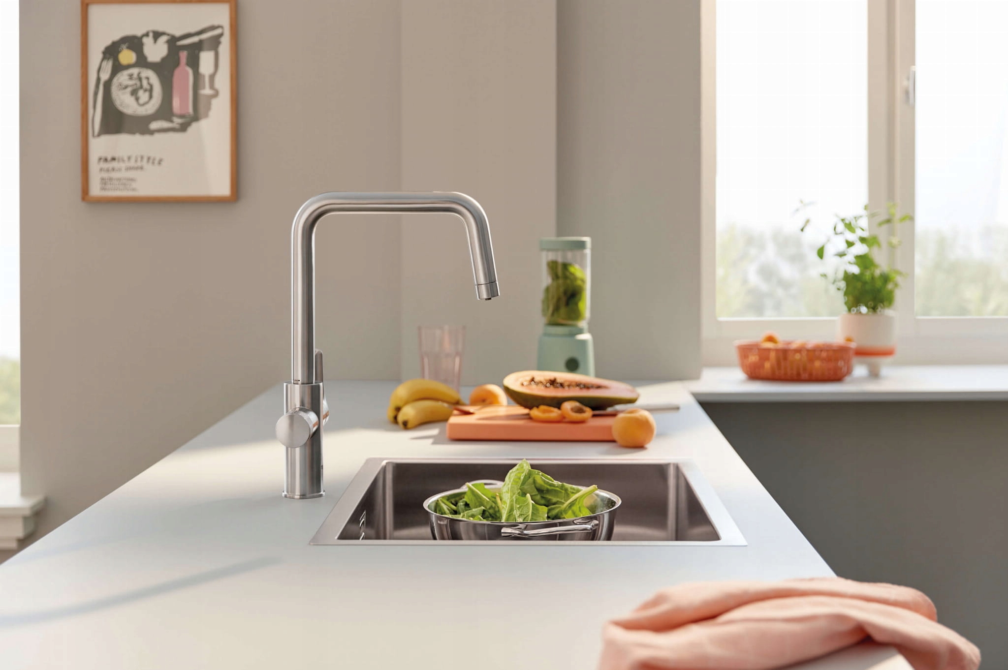 Кухня, оформлена зі смаком – у прямому та переносному сенсі – завдяки кухонному змішувачу GROHE Blue Pure із функцією фільтрації води.