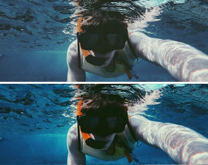 рожевий фільтр - синя вода, неглибоке дайвінг з трубкою. Фільтр виправляє синій та зелений колір