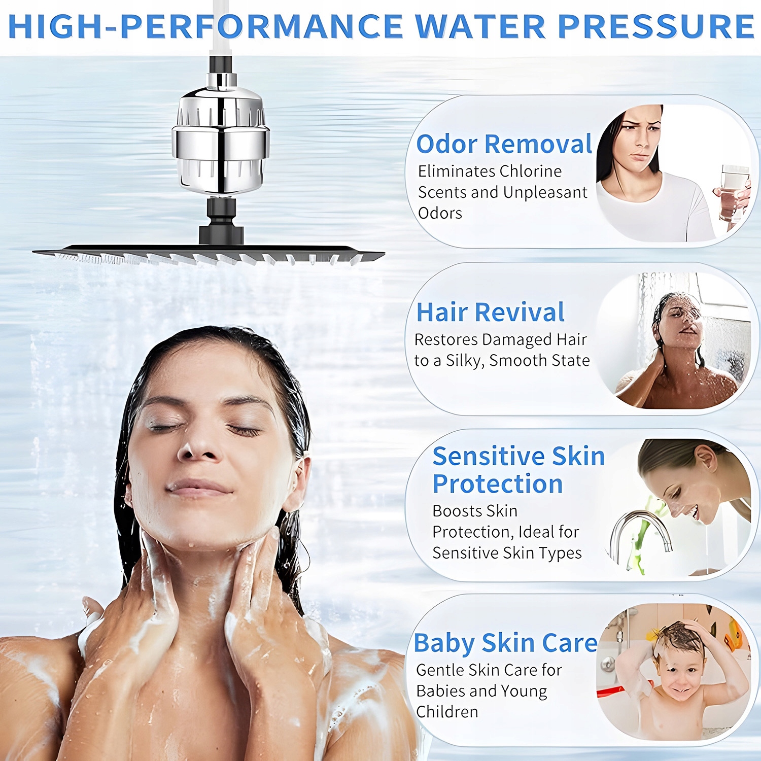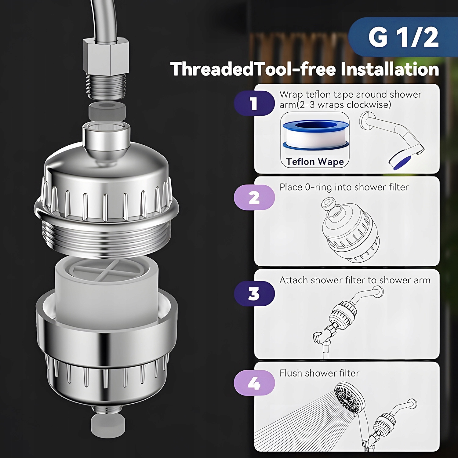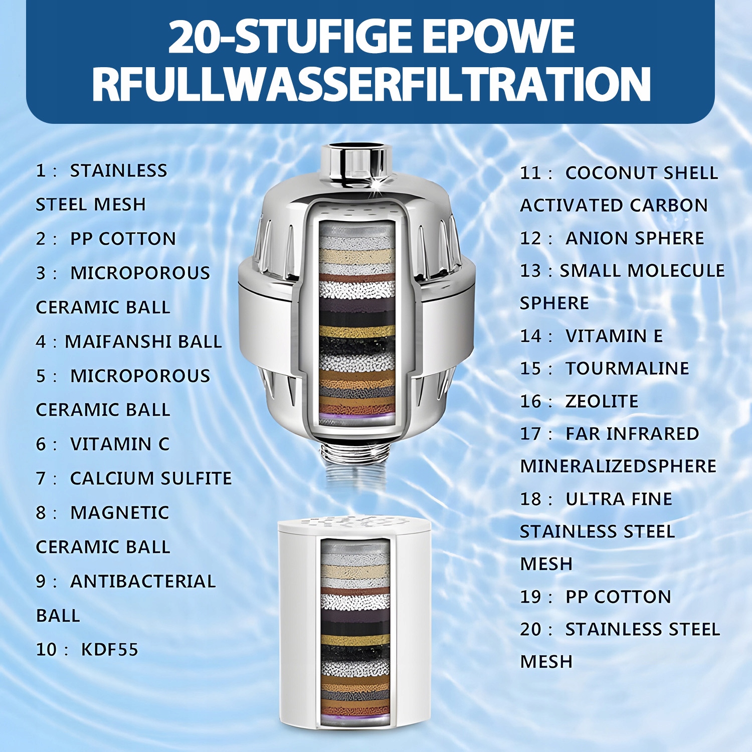 Душовий фільтр містить високо видовий ліжко KDF, яке зупиняє бактерії, важкі метали та ліжко, що нейтралізує ефект сушильної солі та магнію. Він забезпечує приємний і освіжаючий душ у чистому воді. Регулярне використання фільтра для душу робить шкіру більш гладкою та зволоженою.