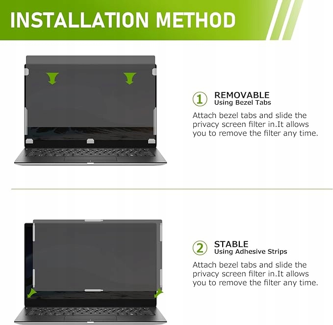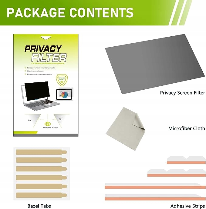 - 【Два способи встановлення】Простий у використанні, тому будь-хто може швидко встановити/видалити. Варіант 1: використовує прозорі клейкі смужки, які надійно кріпляться до будь-якого екрана. Варіант 2. Використовує кріпильні пластини, які легко приклеюються до рамки дисплея та знімаються. Пакет містить набори для кріплення (фільтр конфіденційності x1, 2 x слайдери для кріплення, прозорі клейкі смужки x6, 1 x тканина з мікрофібри).