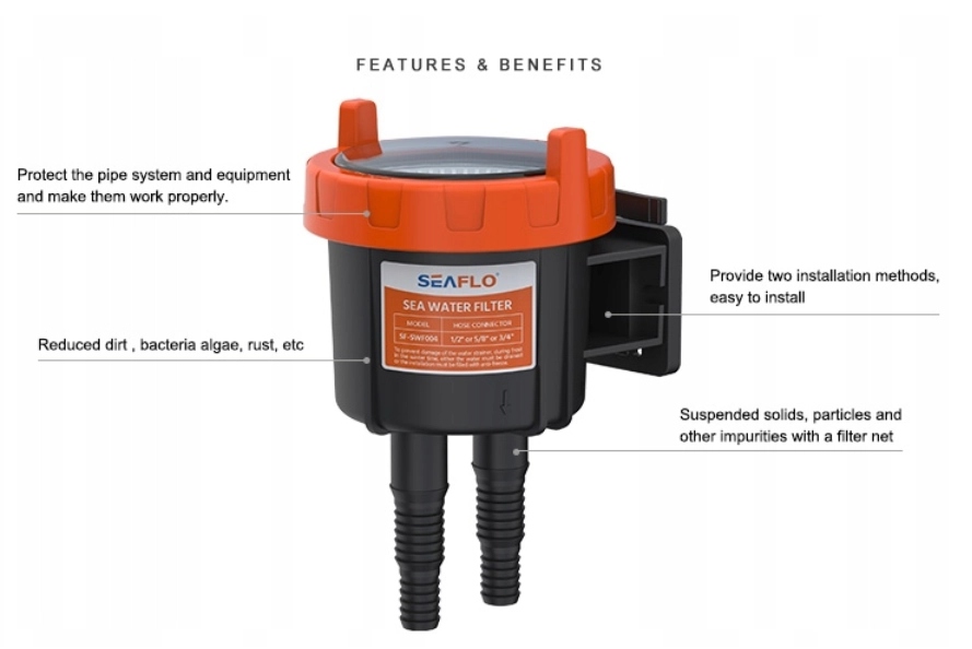 Фільтр морської води охолодження 25-32-38 мм -високоякісний універсальний підвісний водяний фільтр, призначений для охолодження нерухомого двигуна човна, кондиціонування, добре душ та вся установка водної яхти. Виготовлений з пластику.