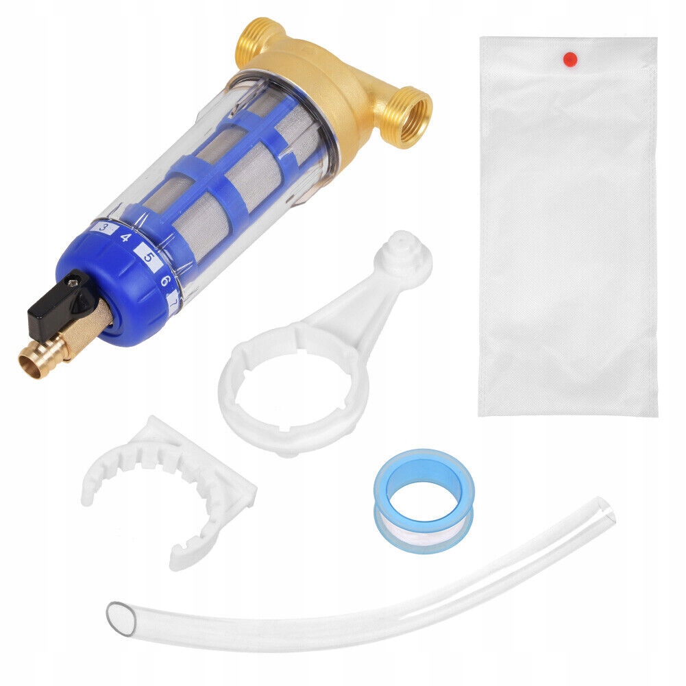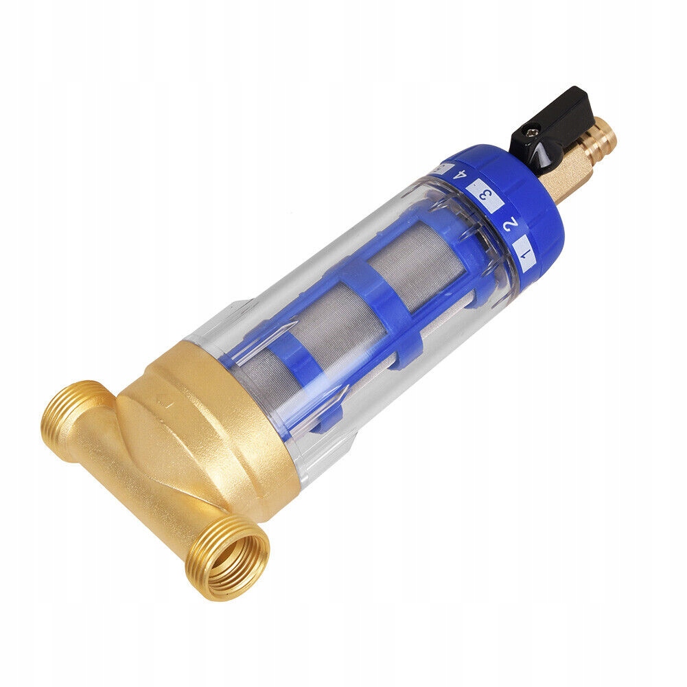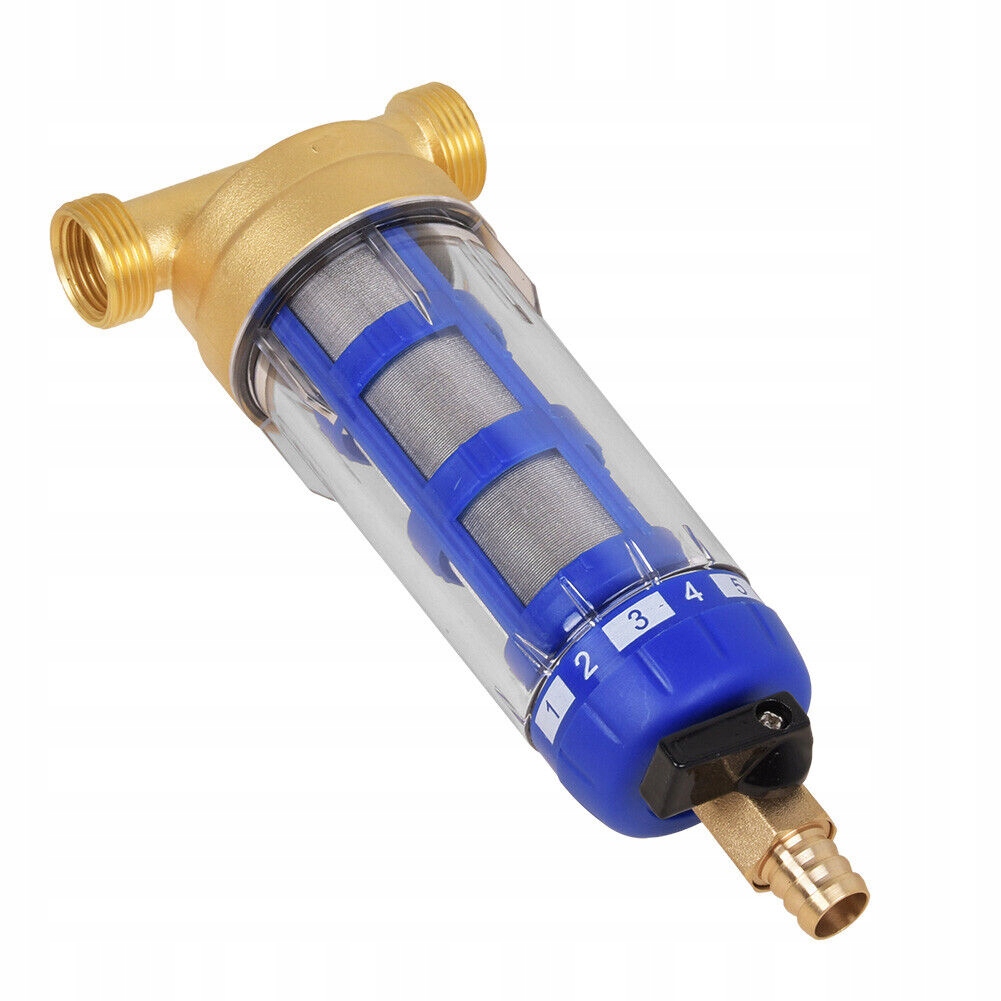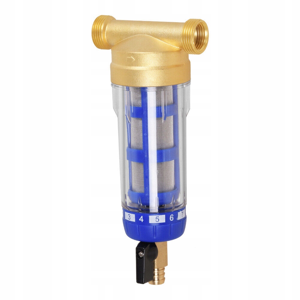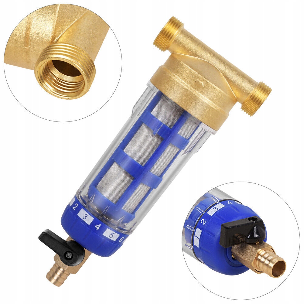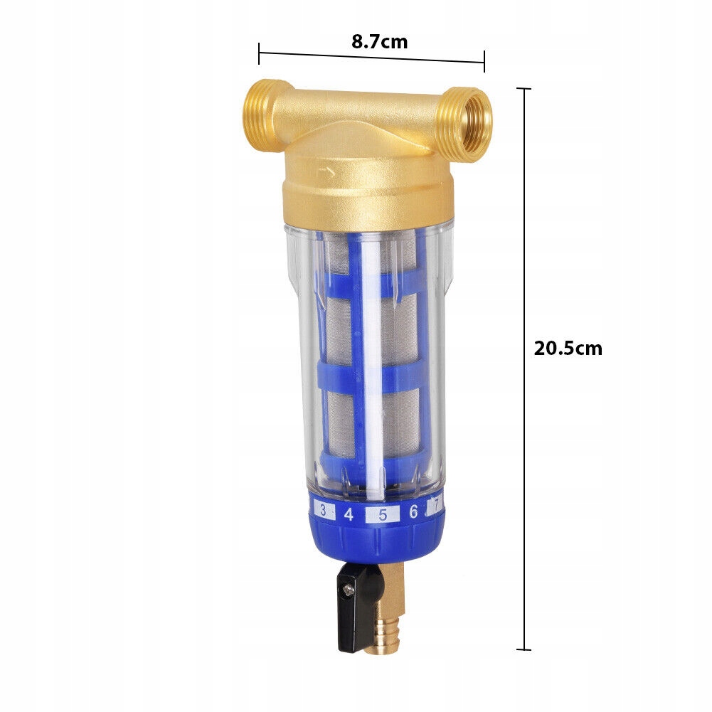 прозорий зовнішній вигляд призначений для полегшення візуального контролю за фільтром; відкрийте нижній клапан і автоматично очистіть фільтр. Рекомендується регулярне полоскання (щодня або щотижня) залежно від кількості води, вмісту піску та твердості, можна використовувати повторно.
