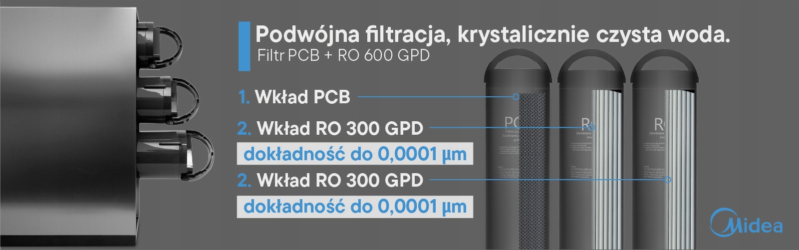 Система фільтрів MIDEA поєднує елегантну, мінімалістичну конструкцію з вищевказаною функціональністю . Простий сріблястий корпус пристрою ідеально поєднується з різними кухонними інтер'єрами, також з обмеженим корисним простором. Пошкодження -гарантія матеріалів довге життя a небалансована структура інвертований фільтр осмосу означає, що вода фільтрується регулярно, а кожна крапля води свіжа і не містить забруднення. Осмотичні фільтри. Компактні розміри системи фільтрів 45 x 10,5 x 41,5 см (глибина x ширина x висота) та Можливість складання в горизонтальному положенні полегшує установку під раковиною або в перерві під кухонною шафою!