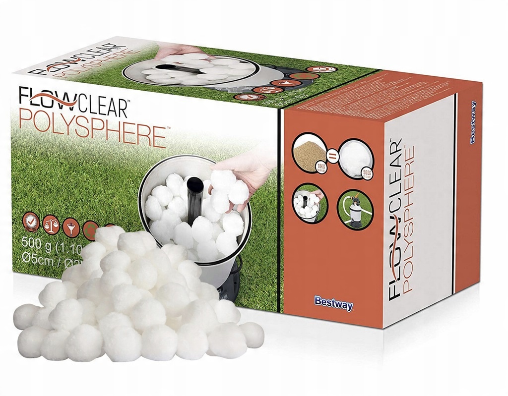 Універсальний фільтруючий елемент останнього покоління Polysphere Flowclear є екологічно чистою альтернативою звичайному кварцовому піску завдяки довшому терміну служби та відмінним властивостям фільтрації й утримання. Спеціальні фільтруючі кульки з мікроволокна ПЕТ (поліетилентерефталат) різної довжини та структури здатні очистити воду у вашому басейні в 10 разів швидше та ефективніше.