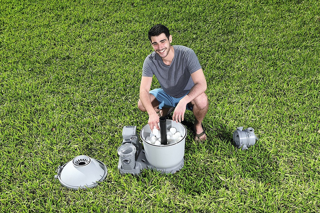 Як використовувати: кульки Flowclear слід розташувати вільно, не зминаючи, замість існуючого фільтра (піску), увімкнути та використовувати фільтруючий насос у звичайний спосіб. Завдяки своєму білому кольору вони є відмінним індикатором забруднення, а отже, і якості процесу фільтрації. Наскільки вони брудні, видно з першого погляду. Коли Flowclear забрудниться, просто промийте ліжко під сильним струменем води або вимийте його вручну, поки воно не стане чистим, і знову вставте в насос. Рекомендується перевіряти стан куль приблизно кожні 4 тижні. При такому використанні Flowclear легко прослужить 5-7 років, залежно від розміру басейну та ступеня забруднення фільтра, забезпечуючи кришталево чисту воду. Найкраще те, що вам доведеться промивати систему фільтрів басейну лише кілька разів на рік, а не чотири рази на місяць! З екологічної точки зору, це чудова новина для нашого водоносного горизонту, а також для нашого гаманця під час оплати рахунків за воду!