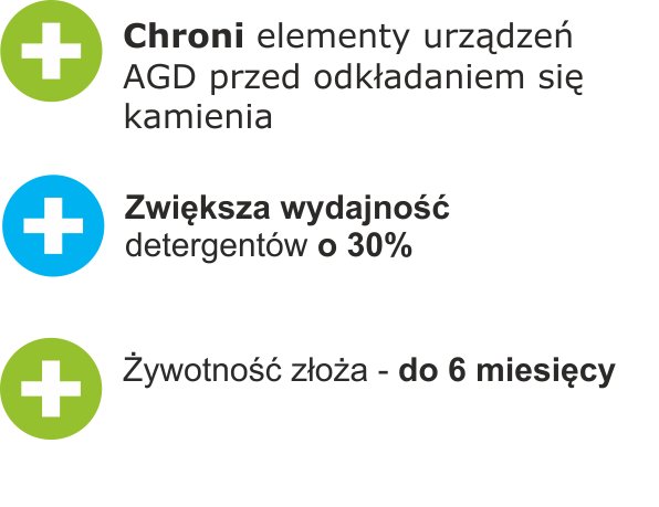 - Фільтр оснащений спеціальним шаром - кристалами поліфосфату, завдяки якому фосфат, що міститься у воді, перетворюється на фосфат кальцію, завдяки чому утворюється т.зв. «накип» не накопичується на побутовій техніці.