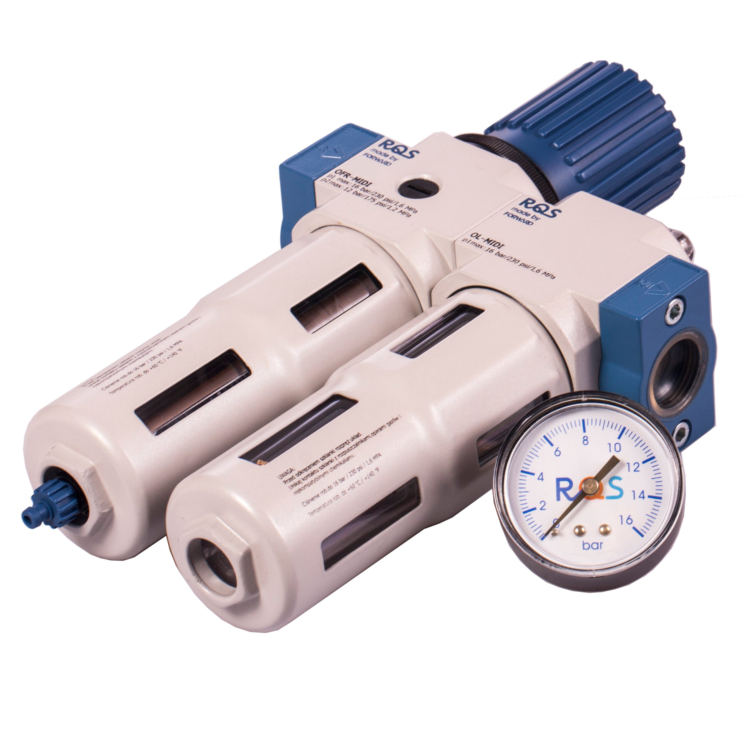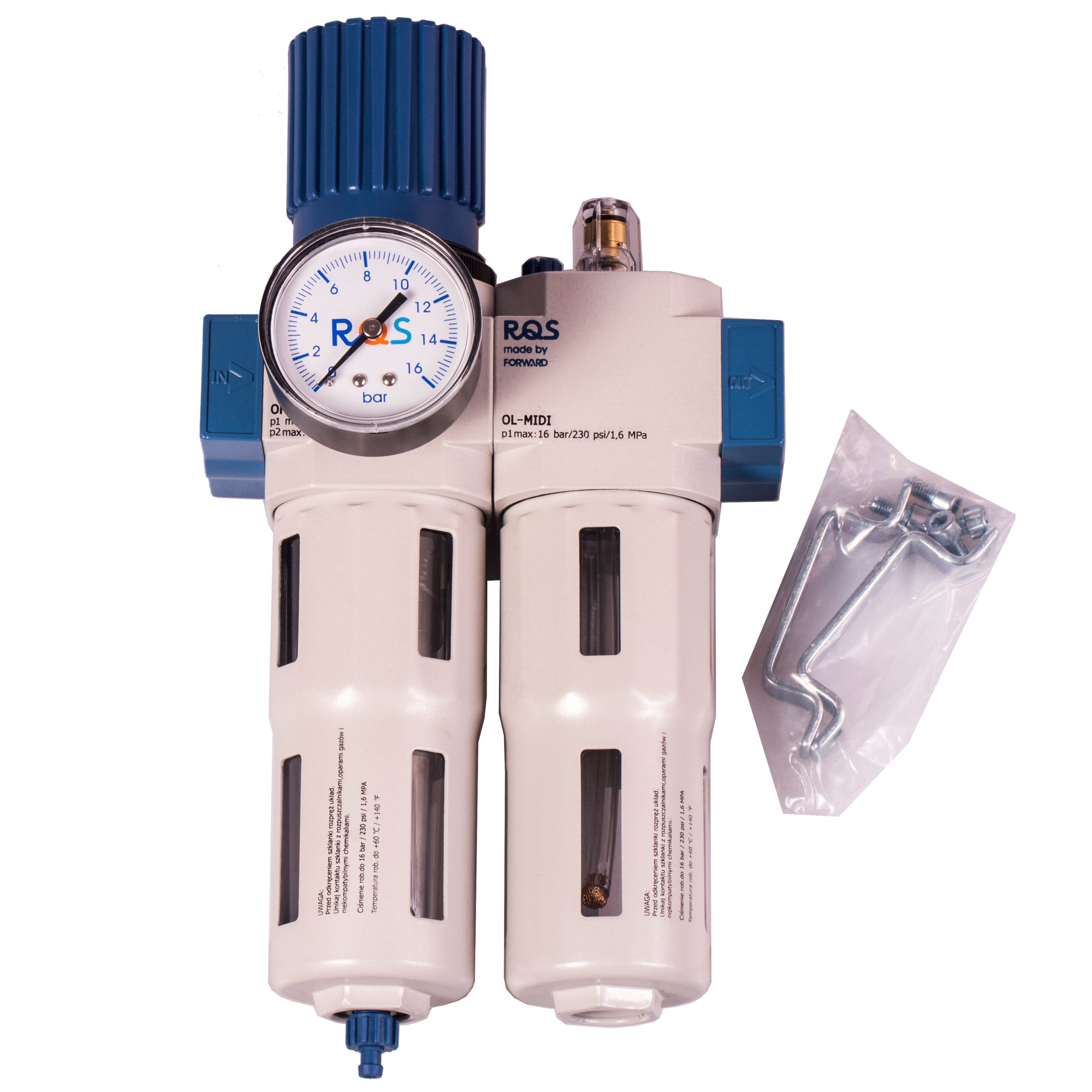 Відновлений блок підготовки повітря від RQS. Редуктор+Фільтр+маслянка RQS 3/4" RECTUS. Набір з двох частин з нанометром і кріпильними кронштейнами. Набір дозволяє осушити і змастити повітря і встановити відповідний тиск на виході.