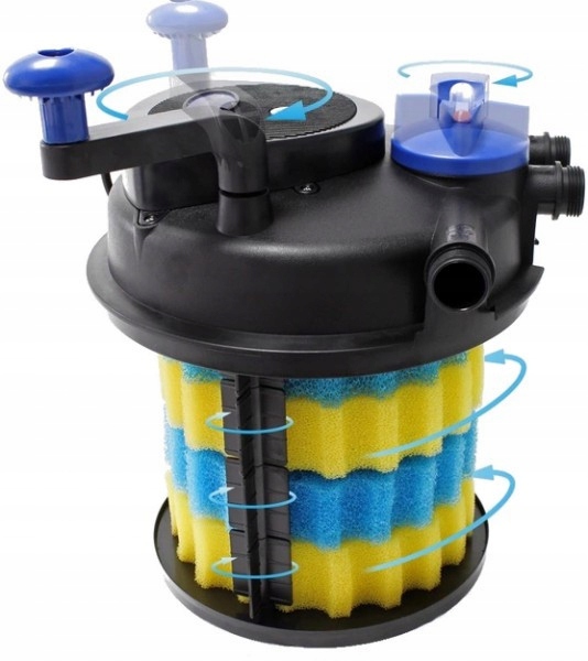 Напірний фільтр серії CPF обладнаний фільтруючими картриджами та їх правильний вибір і розташування забезпечує належну фільтрацію ставка. У фільтрі використовується багатоступенева механічна та біологічна фільтрація. Механічні вставки - крупнозерниста біо-губка (синя) і дрібнозерниста біо-губка (жовта), які забезпечують ідеальне і дуже ретельне очищення води від усіх механічних забруднень і є домом для нітрифікаційних батарей. Тут відбувається розкладання всіх біологічних забруднювачів, у тому числі: розкладання залишків їжі, залишків мертвих рослин тощо. Біологічні картриджі мають дуже велику активну (фільтраційну) поверхню. Біогубки є чудовим субстратом для корисних нітрифікуючих бактерій, які очищають воду від токсичних сполук азоту (NH4 і NO3). Крім того, використовувана UV-C лампа знищує водорості у воді, бореться з бактеріями та паразитами, небезпечними для вирощуваної риби та рослин, усуваючи при цьому причини більшості захворювань - це дає ефект кришталево чистої води. Лампа працює шляхом опромінення води, що протікає через неї, УФ-С променями, що викликає загибель клітин водоростей. Лампа UV-C також ефективна проти бактерій, паразитів і найпростіших.