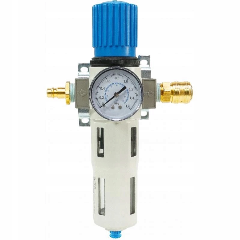 Фільтр-модуль оснащений фільтрувальним вкладишем. Конденсат збирається в накручується ємність з ручним зливом. Коли ємність заповниться (приблизно на 10 мм нижче фільтруючого елемента), видаліть конденсат, відкривши зливний кран. Діапазон вимірювання манометра 0 - 16 бар. Циферблат градуйований у стовпчиках з точністю до 0,2 бар. Манометр можна встановити в порт на корпусі фільтра-редуктора - на вибір є два підключення манометра: спереду або ззаду. Невикористаний порт слід заткнути штекером, що входить до комплекту.