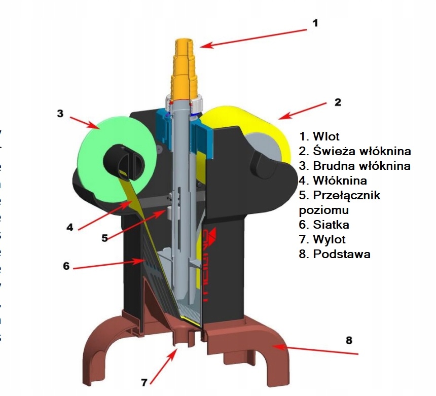 Забруднена вода направляється через вхідний отвір до камери відходів. Він проходить через діафрагму і повертається в картер. Якщо мембрана заповнена сміттям, струм через мембрану зменшується, а рівень води в камері для брудної води зростає. Коли він досягає певного рівня, перемикач рівня запускає двигун, і свіжі неткані матеріали спрямовуються вперед.
