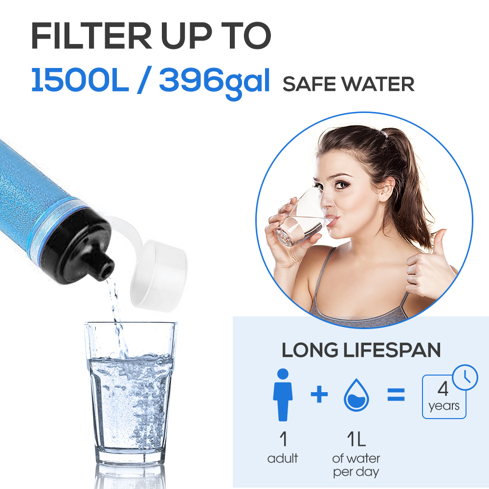 Міні та легка солом’яна фільтрація забезпечує до 1500 літрів (396 галонів) питної води. 3-х ступенева система фільтрації, в тому числі видаляє 99,999% шкідливих речовин (забруднювачі, запахи, хлор і органічні хімікати та ін.) і покращує смак. Забезпечення найбезпечнішою водою в найгірших умовах. Ідеально підходить для відпочинку, походів, кемпінгу. Він також є хорошим компаньйоном для розвідки, внутрішніх і міжнародних подорожей, готовності до надзвичайних ситуацій.