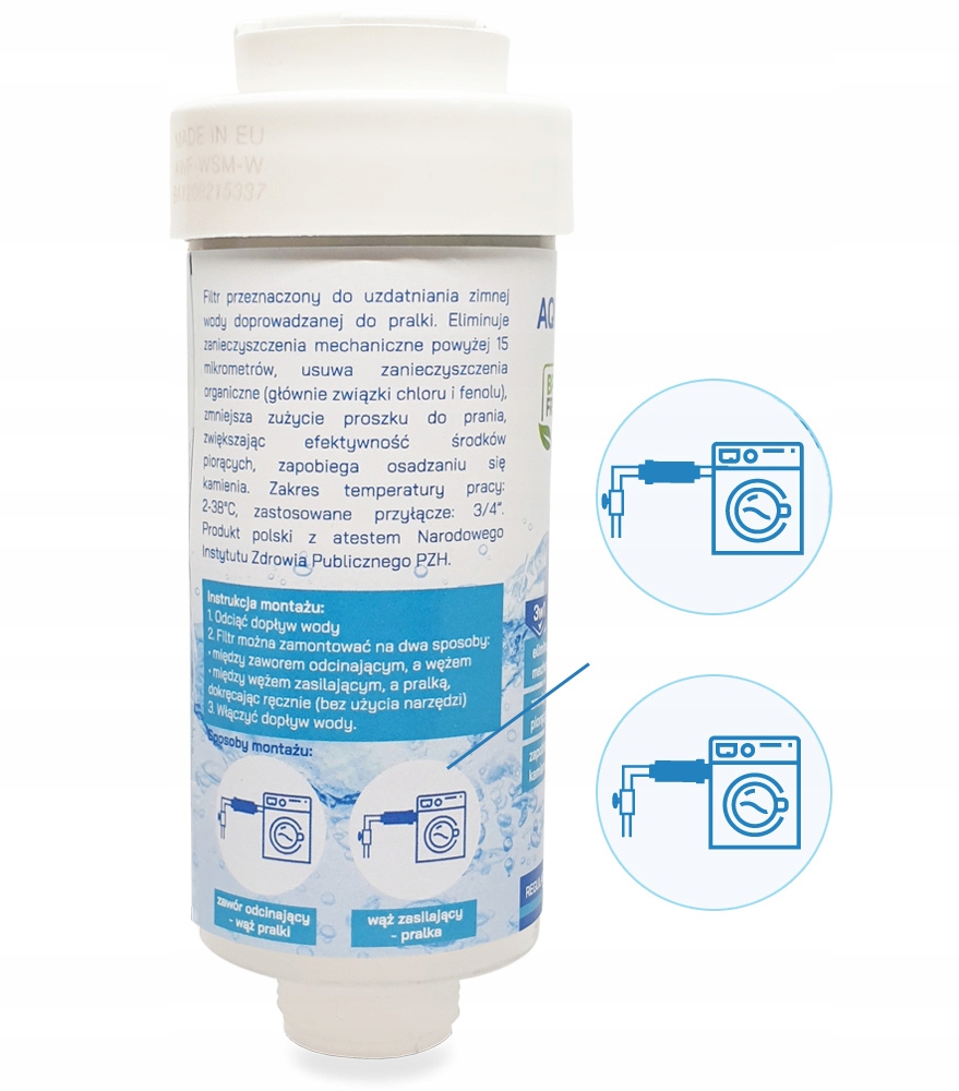 Фільтр для пральної машини AQUA shock захищає пральну машину від шкідливого впливу вапняного нальоту. Зменшує витрату миючих засобів і підвищує їх ефективність. Використовуючи фільтр пральної машини, ми можемо позбутися жорсткої води в пральній машині. Поліфосфат, що міститься у фільтрі, не знижує жорсткість води, а створює тонкий захисний шар у трубах/пристроях, що запобігає утворенню накипу. Заслугою цієї дії є кристалізація карбонатів. Покращення якості води помітно відразу. Наша білизна стане м’якшою і не втратить належний колір.