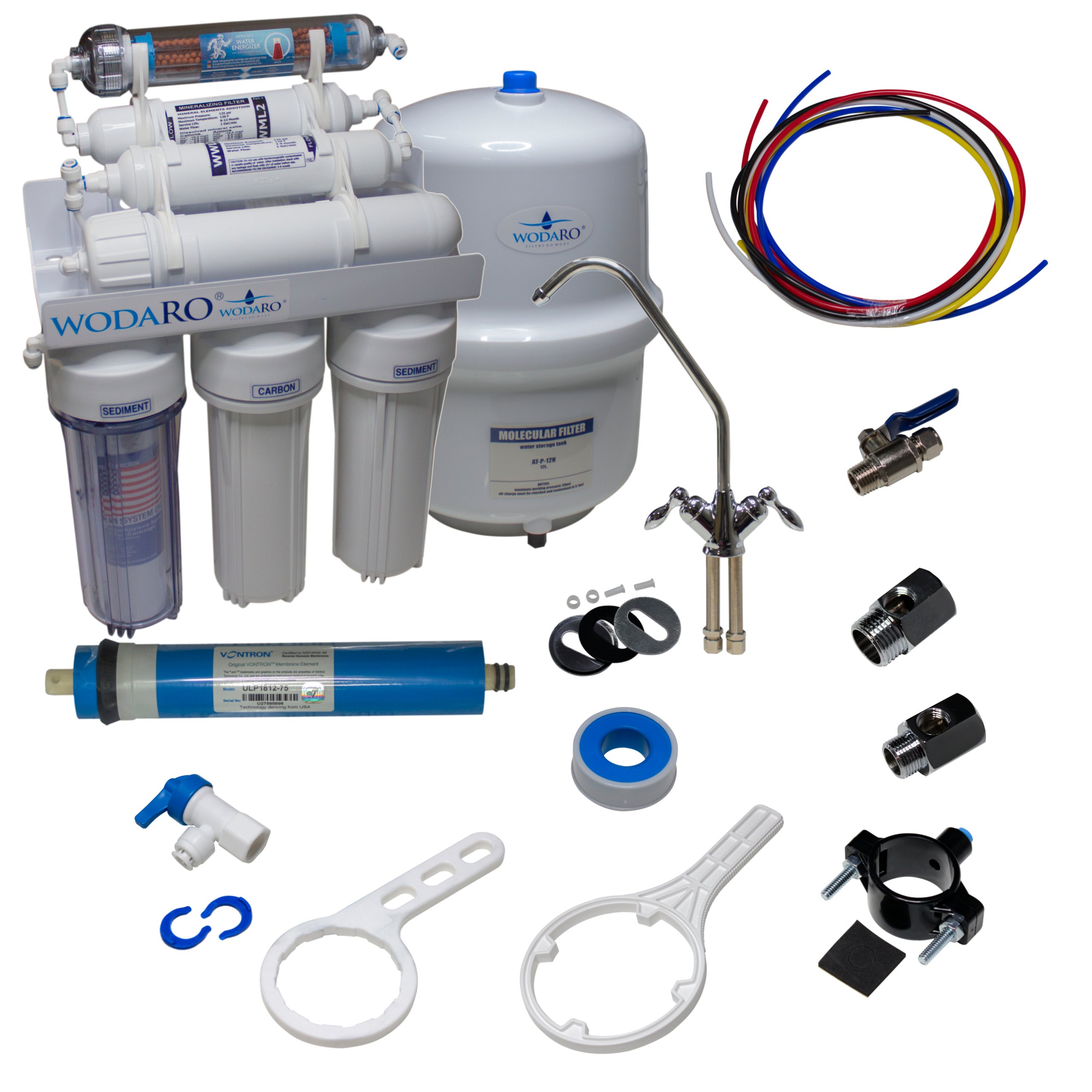 4. VONTRON 75 – осмотична мембрана. Це набір напівпроникних тонкошарових мембран. У поєднанні з фільтрами з поліпропіленового нетканого полотна та активованого вугілля, що дозволяє отримувати справді чисту та корисну воду. Осмотична мембрана видаляє 96-99% усіх розчинених у воді сполук, а також бактерій і вірусів.