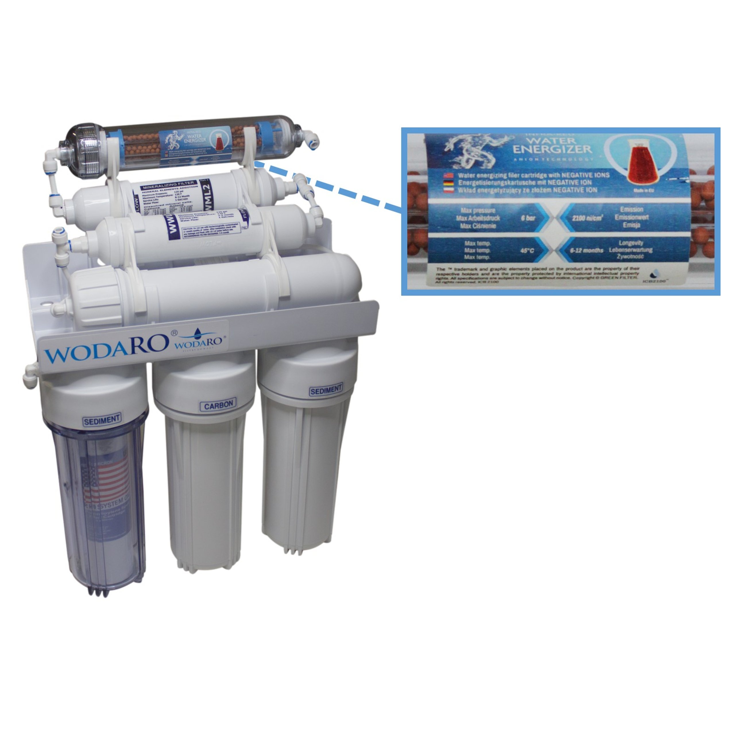 6. WML2- картридж лінійного мінералізатора. Осмотична фільтрація видаляє з води 96-99% усіх домішок і мінералів. Доломітовий мінералізатор WML2 збагачує воду мінералами, втраченими в процесі осмотичної фільтрації. Вода, що протікає через мінералізатор, збагачується необхідними для організму людини елементами, такими як: кальцій, магній, калій, натрій.