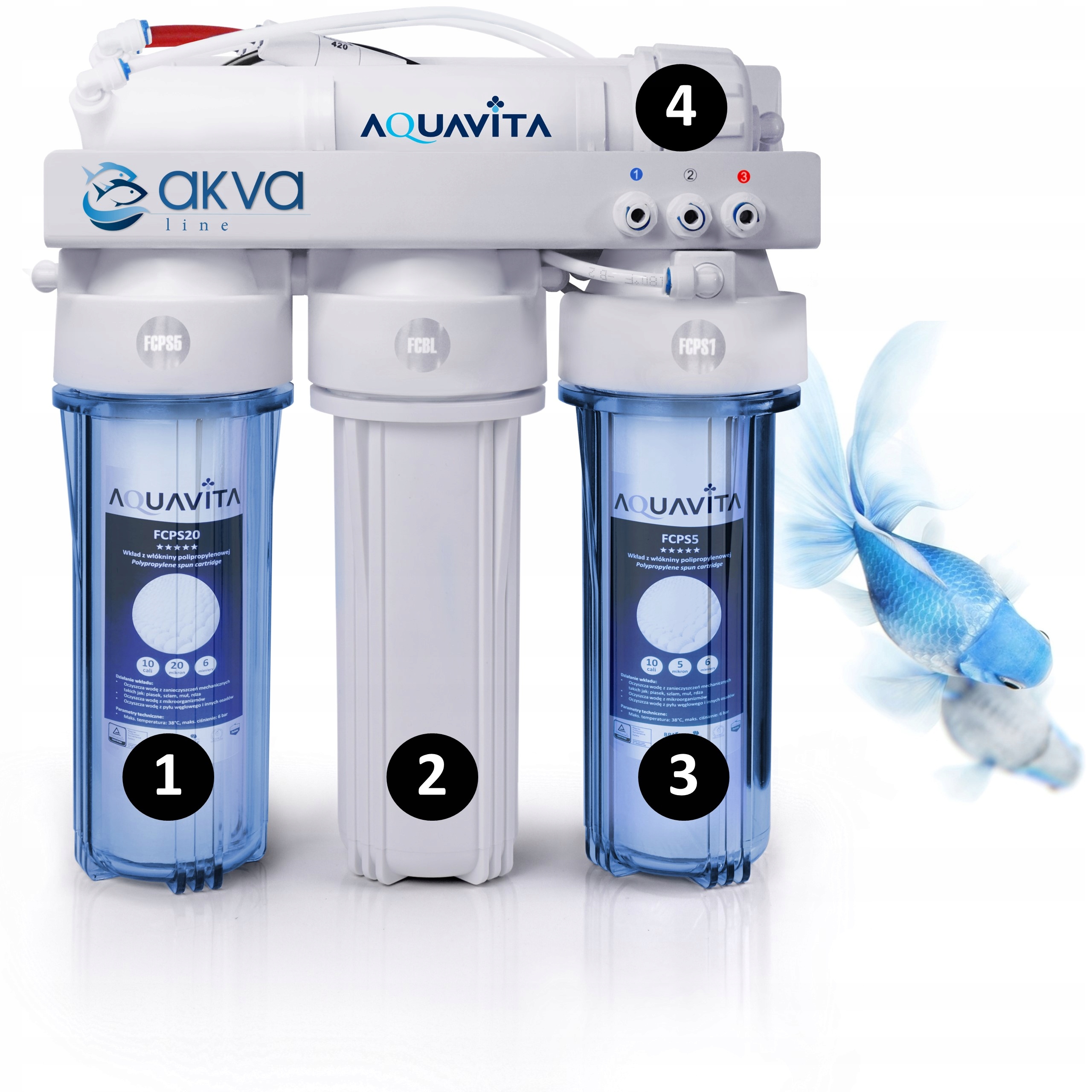 Пропонований осмотичний набір RO4, завдяки використанню 10-дюймових осмотичних корпусів і картриджів AQUAVITA, дозволяє значно збільшити потік порівняно з лінійними фільтрами. Додатковою перевагою набору AQUAVITA є те, що всі з’єднання розміщені на передній панелі.