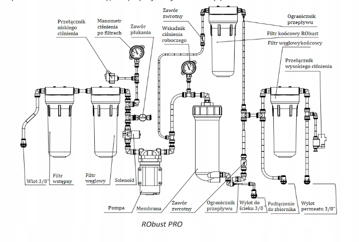 На передній панелі RObust PRO є два манометри, один з яких відображає тиск живильної води після попередніх фільтрів, а інший - тиск після насоса в установці RO. Крім того, для зручності користувача на спеціальній інформаційній табличці вказані рекомендовані значення тиску для манометра та рекомендації щодо вирішення можливих проблем, якщо ці значення не відповідають необхідним.