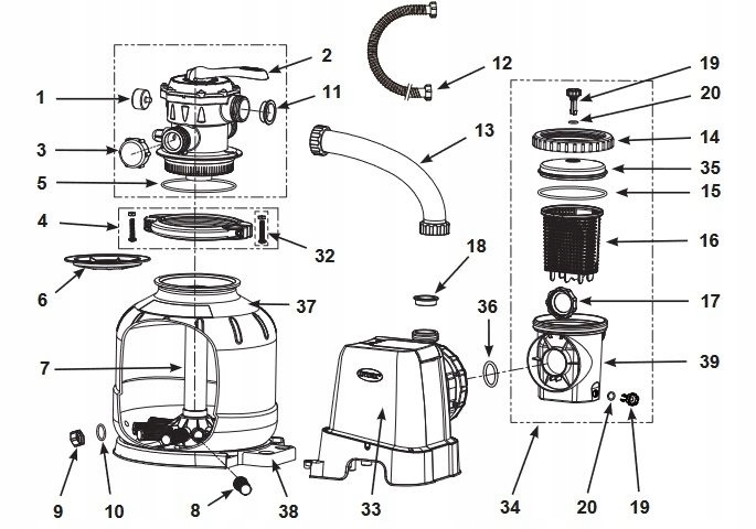 - Рекомендована кількість начинки піску 55 кг або 38 кг фільтра (Наповнення фільтра не є частиною пакету фільтрів)