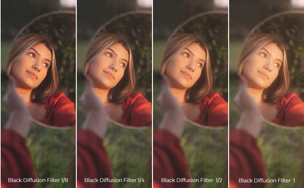 Крім того, завдяки фільтрам Black Diffusion усі недоліки сфотографованих і знятих об’єктів, особливо під час портретної зйомки, такі як відтінки шкіри, зморшки, пори шкіри, і т. д. стають пом'якшеними, згладженими і зникають. Навколо джерел світла створюється класичне ніжне сяйво.