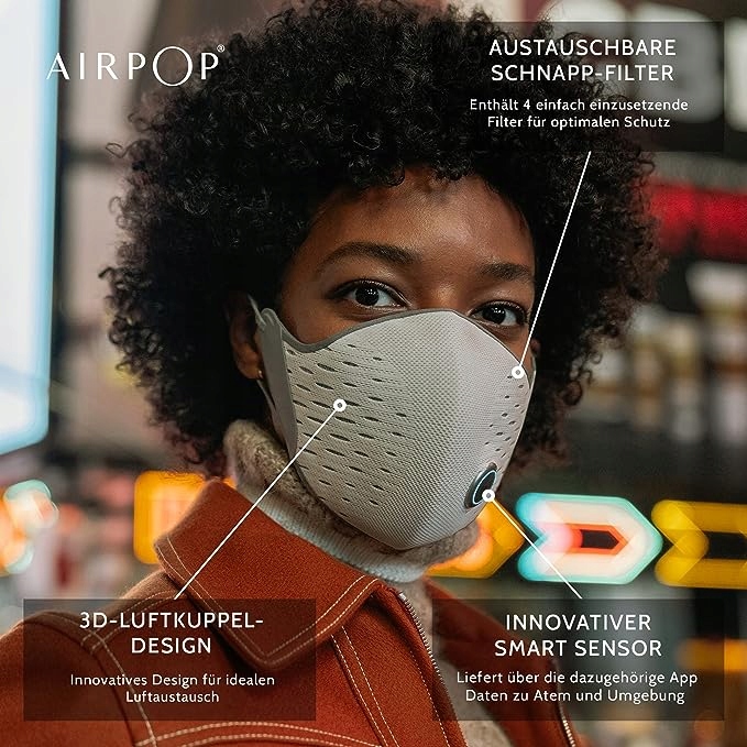 - 【Комфортна посадка】 Маска Airpop Active Halo складається з 4 шарів надзвичайно міцного нетканого матеріалу. Зовнішній шар AIRKNIT гнучкий і стабільний, м'який і водночас міцний і стійкий до вологи, води та стирання. Внутрішній розплавлений шар подвійної товщини заряджається електростатично для максимальної ефективності. Напрямок мембрани також зменшує запотівання під час носіння окулярів.