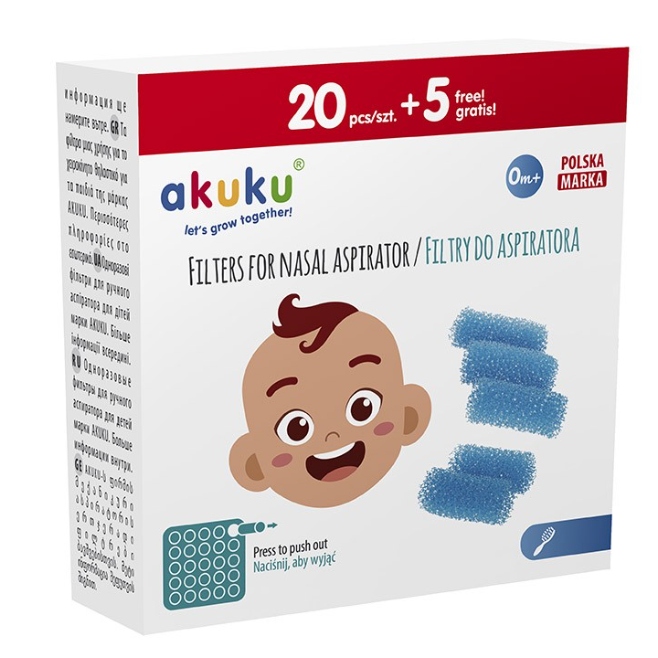 Змінні фільтри для аспіратора AKUKU, що перешкоджають потраплянню виділень з носа в трубку з мундштуком і таким чином запобігають можливому зараженню людини, яка чистить ніс дитини. Вони необхідні для правильної та гігієнічної роботи аспіратора. Вони зберігають виділення з носа в пристрої та захищають вихователя від інфекції.