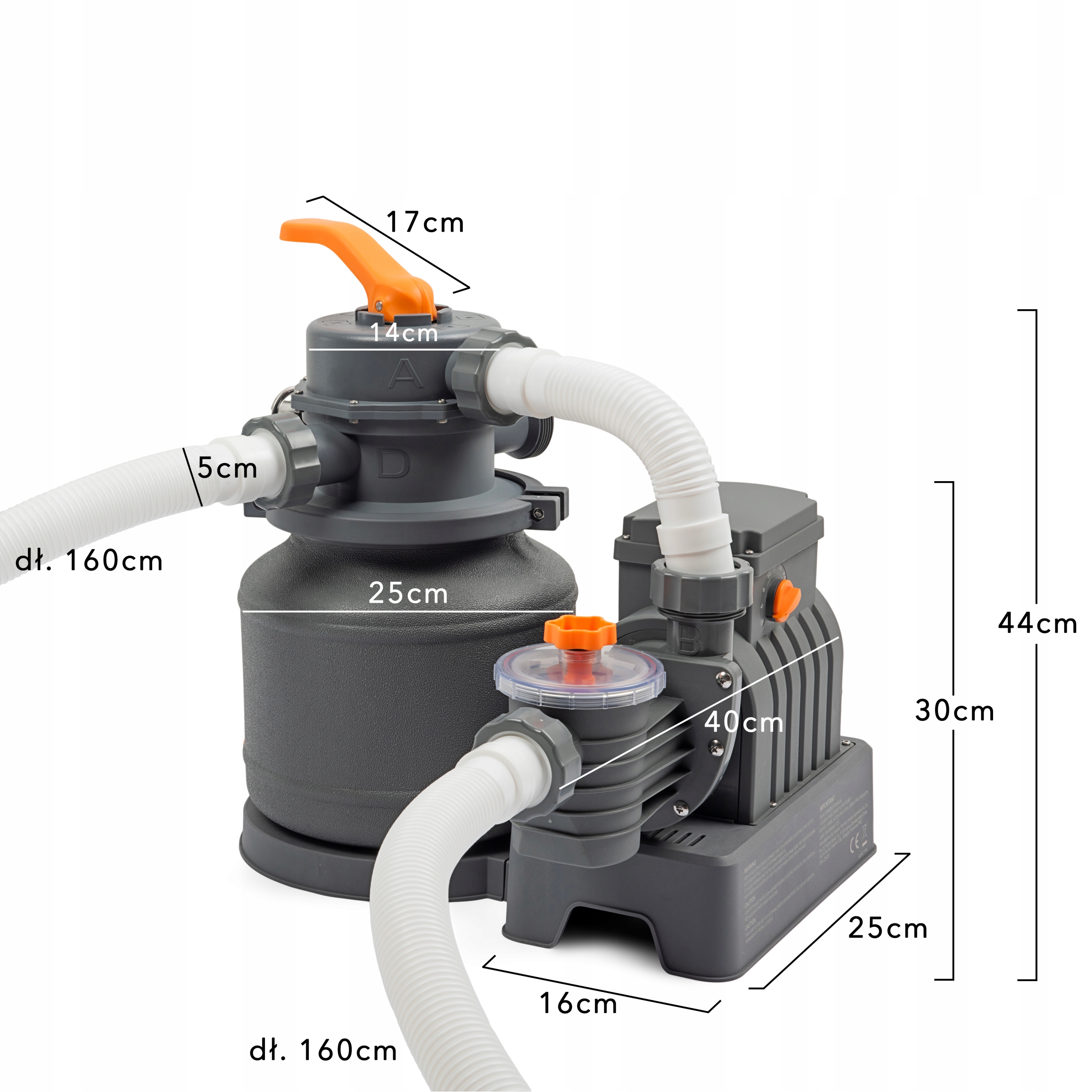 Вбудований точний і зрозумілий манометр полегшує зчитування параметрів і контроль тиску в насосі. Цей елемент відіграє ключову роль у правильній роботі фільтра, він використовується для вимірювання тиску, який підтримує постійний рух води під час фільтрації. Неправильний тиск негативно вплине на якість води в басейні. Занадто високий тиск може спричинити витік піску у воду басейну, занадто низький тиск спричиняє помутніння води. Це трапляється, коли пісок надмірно забруднений і його потрібно промити, або коли засмічені фільтри спричинили засмічення, перешкоджаючи вільному потоку води. У такому випадку зазвичай допомагає перевірити та очистити фільтри, впускний та вихідний шланги та сітку, яка вловлює більші забруднення.