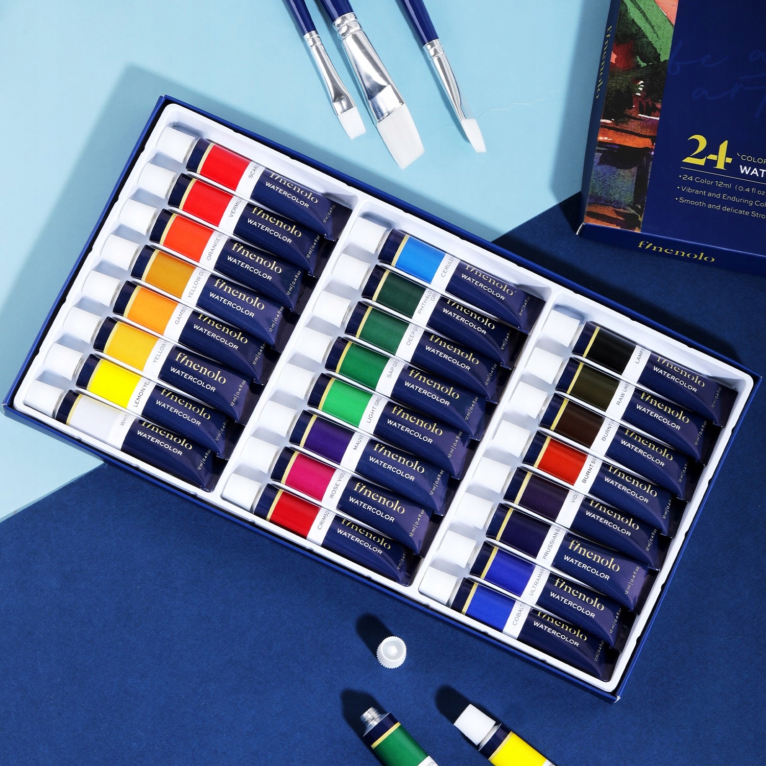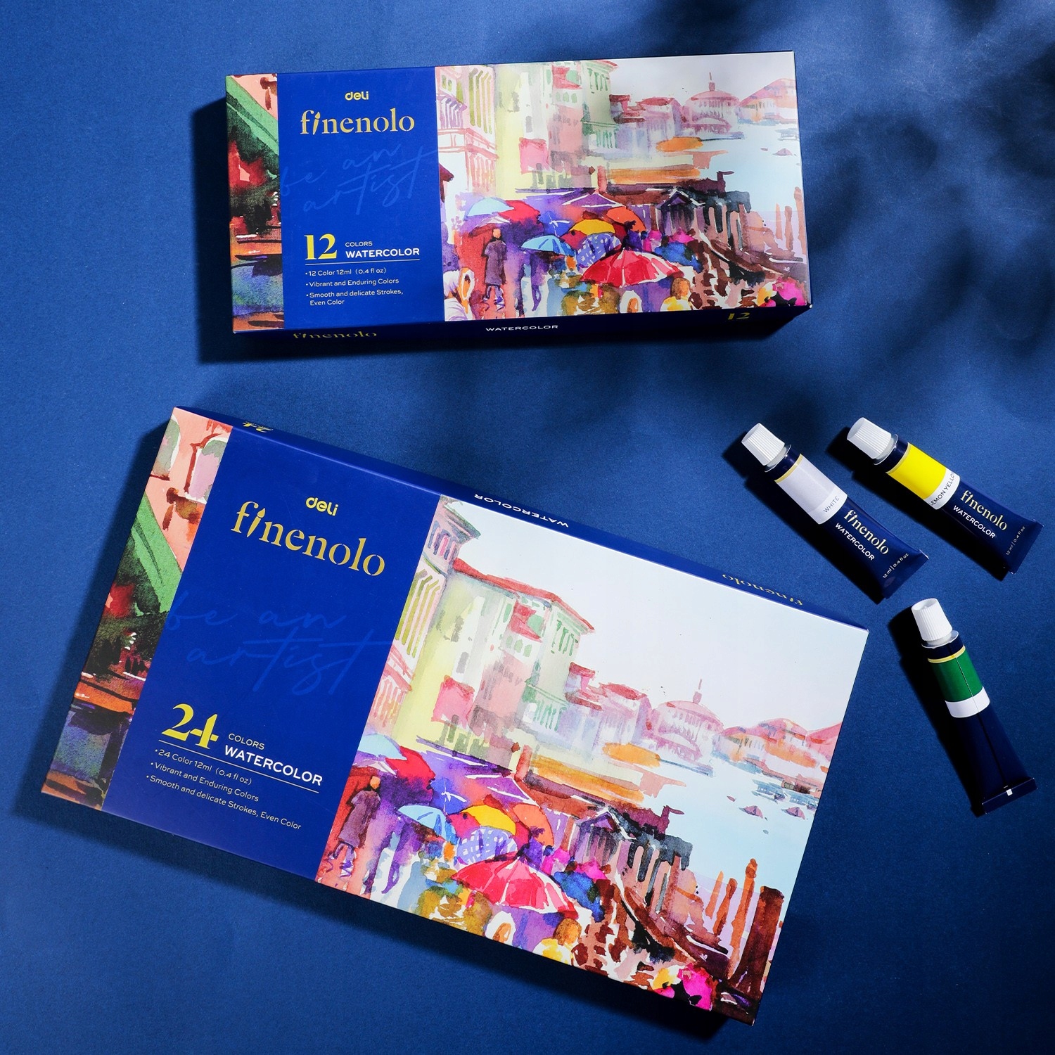 акварельні акварельні фарби Deli, встановлені з серії Finenolo 24 кольори 12 мл труб кожна Сильно пігментовані кольори Відмінне покриття Зручна коробка для безпечного зберігання