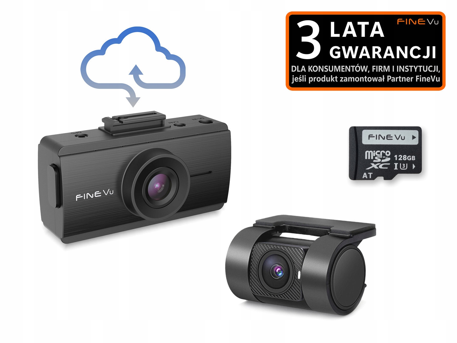Набір включає повне обладнання, включаючи високоміцну картку пам’яті FineVu 128 ГБ. Для класичного режиму паркування (без хмарної функції) не потрібно купувати додаткові кабелі, зовнішні модулі чи адаптери живлення. FineVu GX35 CLOUD має все це в стандартній комплектації. Щоб використовувати додаткові хмарні функції, диктофон повинен мати доступ до Інтернету, напр. через зовнішній мобільний маршрутизатор Wi-Fi з модемом LTE, точкою доступу смартфона тощо (продається окремо).