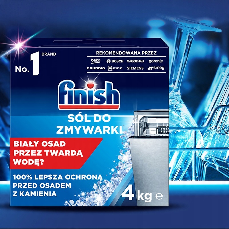 Сіль Finish була створена спеціально для пом’якшення води та захисту вашої посудомийної машини від шкідливого впливу жорсткої води. Рекомендується використовувати кухонну сіль замість інших видів кухонної солі, яка може містити домішки, які можуть пошкодити посудомийну машину. Завдяки своїй високій чистоті Finish Salt забезпечує на 100% кращий захист посудомийної машини від вапняного нальоту*.