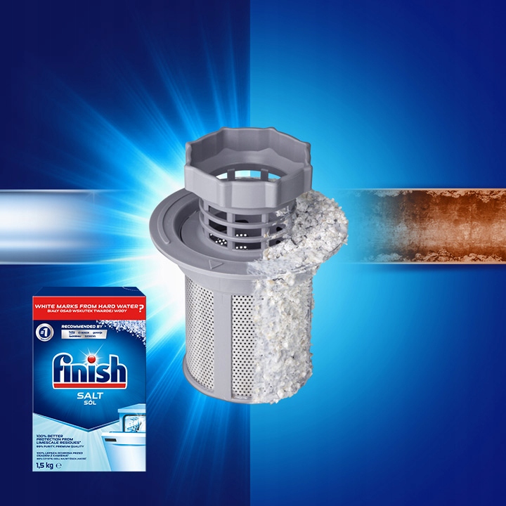 Реагенти, що містяться в солі для посудомийної машини Finish, пом’якшують воду та захищають посудомийну машину від корозії.