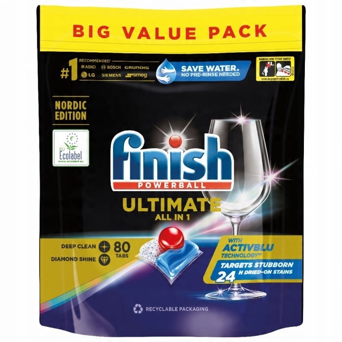 Finish Ultimate All in 1 означає бездоганно чистий і блискучий посуд із першого використання кожного разу. Завдяки технології Activlift Technology ефективно видаляє навіть найстійкіші залишки їжі навіть через 24 години без попереднього замочування. Капсула також захищає та зберігає скляний посуд і столові прибори чистими, зберігаючи їх блиск після кожного миття.