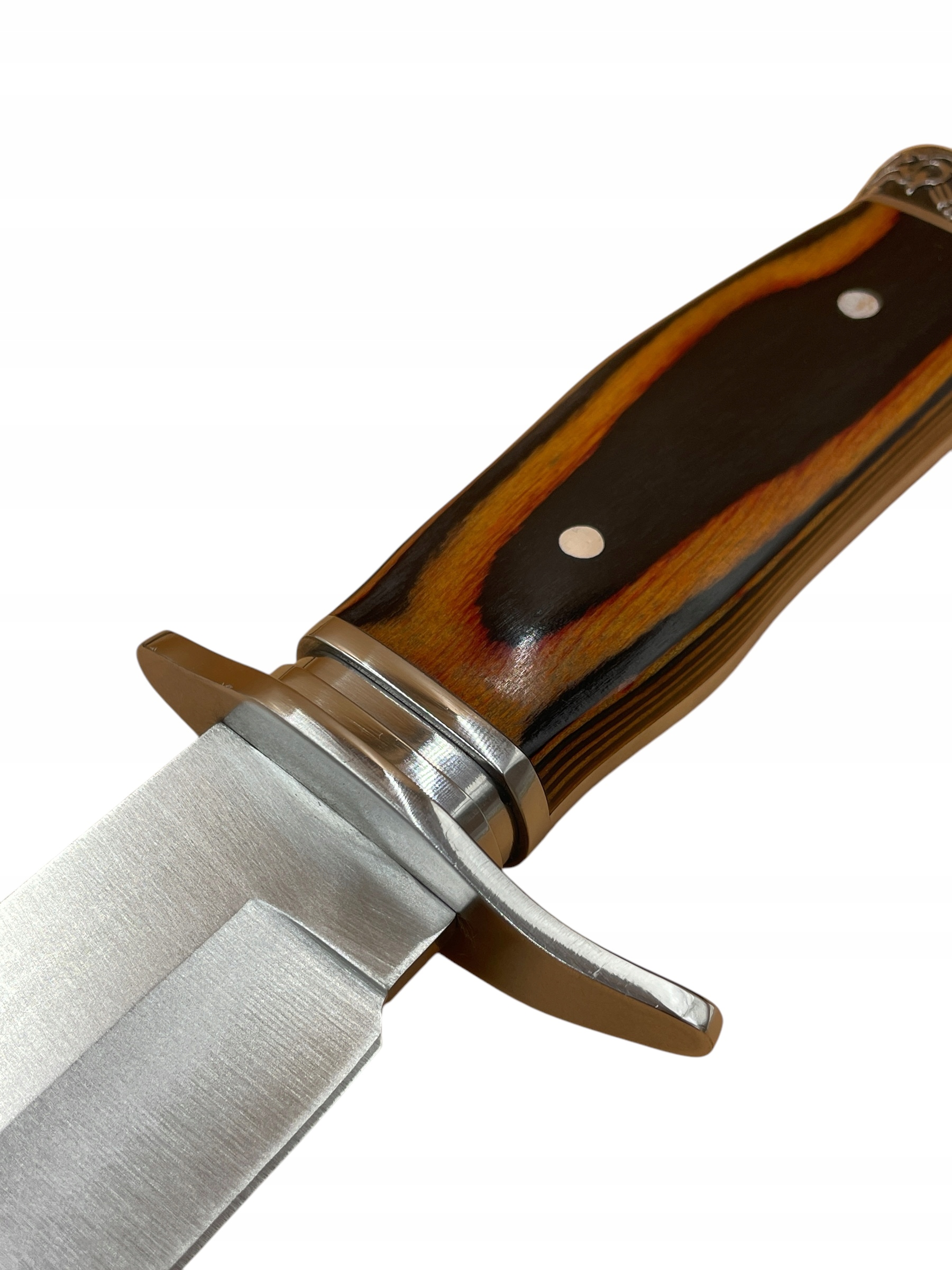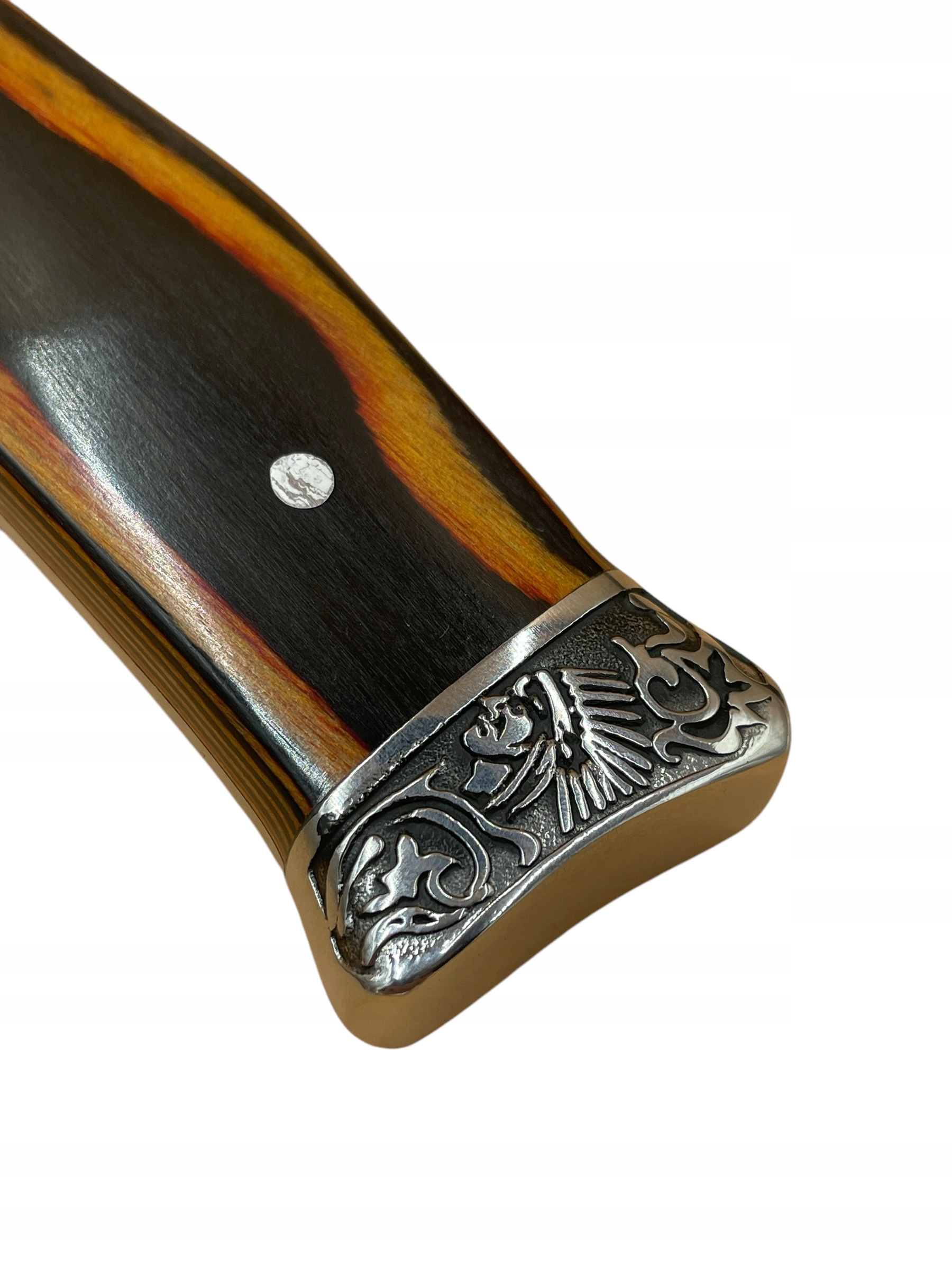 обробка ножів з незвичайною рукою. JELEC, прикрашений латунним прапором, закінчуючи латунними заклепками, додає кілька очок престижу. Продуктивність цього ножа вимагала багато роботи.