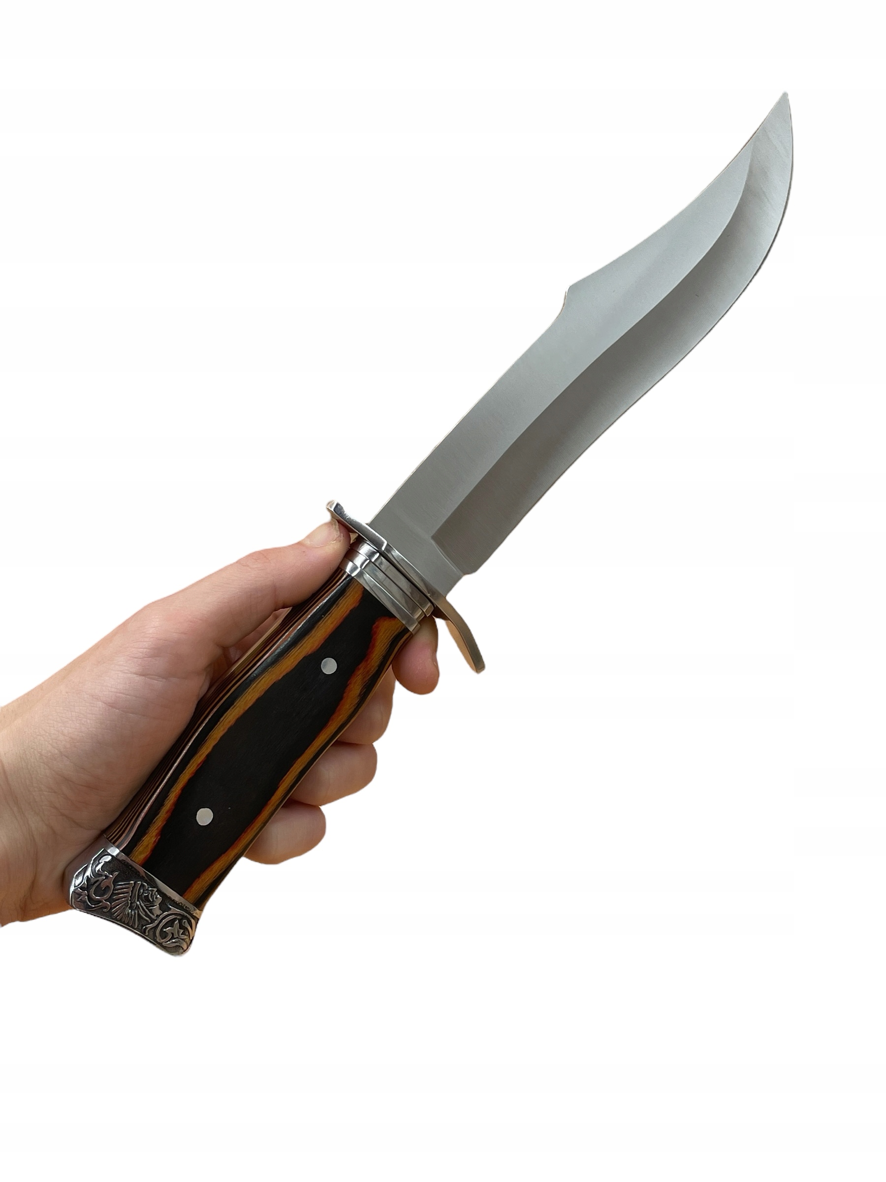 Лезо мисливського ножа велике, виготовлене з хорошої сталі, відшліфованого високого блиску.