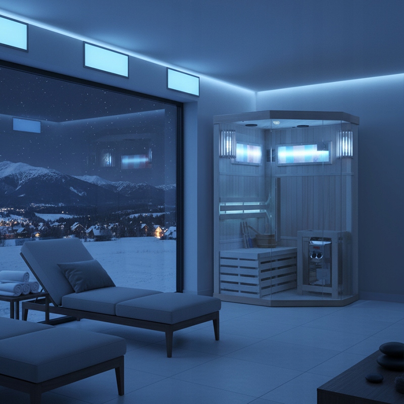 ☑️ LED КОЛЬОТЕРАПІЯ: різнокольорове підсвічування по всій ширині сауни на основі на звороті, 7 кольорів