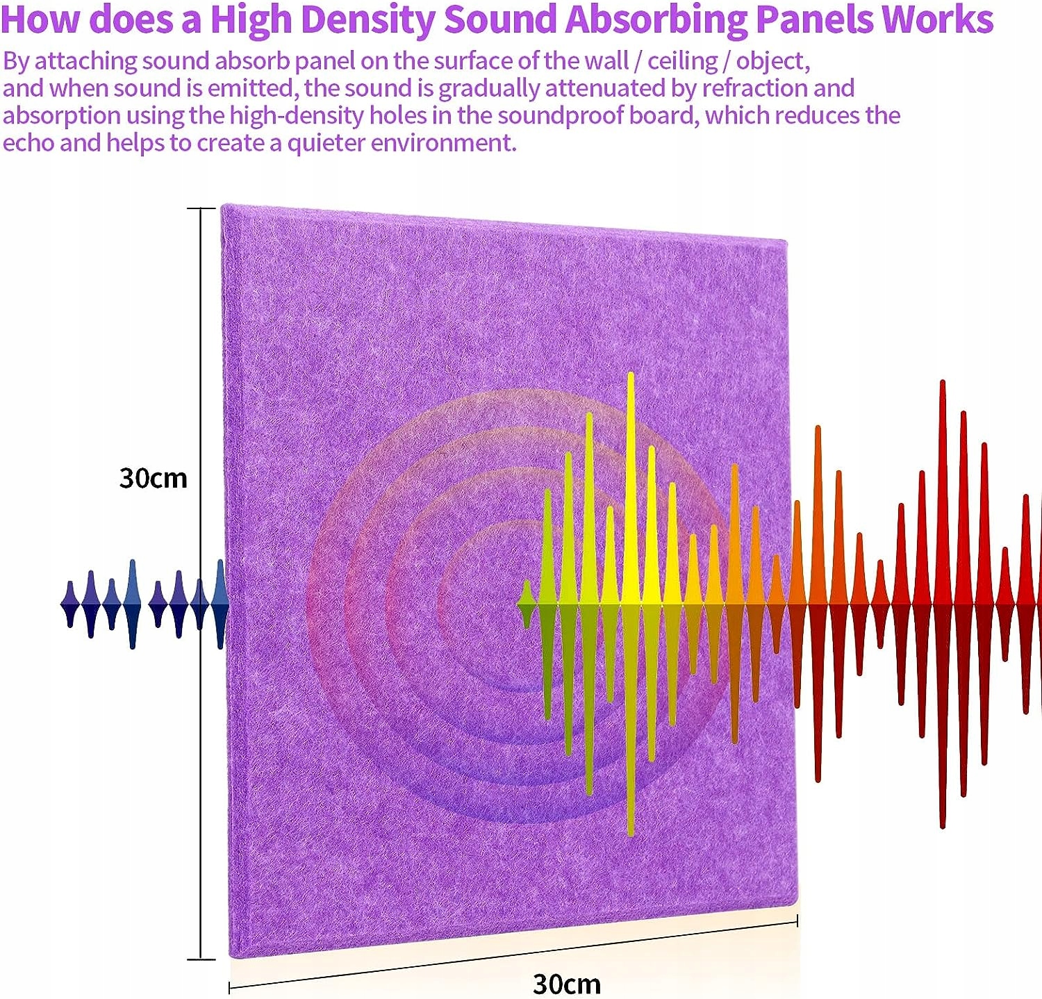 Ідеальне поглинання звуку: кожна панель має розміри 30 х 30 х 1 см та високу щільність 230 кг/м³. Завдяки високій щільності, ця акустична піна ефективно обмежує надмірне відображення звуків від стіни, забезпечуючи відмінну звукоізоляцію та відмінне поглинання звуку.