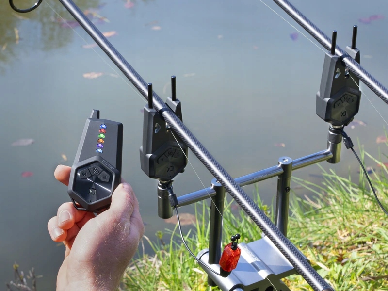 Сигналізація оснащена трьома кнопками. За допомогою кнопки всередині ви можете ввімкнути або вимкнути його. вимкнути щось. При довшому утриманні середньої кнопки вмикається підсвічування колеса удару, яке створює дуже гарний візуальний ефект у темряві, і водночас служить нічником, який дозволяє легко визначити розташування вудилищ вночі. Крім того, коротким натисканням середньої кнопки можна вибрати один з восьми тонів. Для зворотного пострілу «парашут» відп. буде повідомлено іншим звуковим сигналом. За допомогою кнопки на лівій стороні звукового сигналу (V) ви можете вибрати потрібну гучність, включаючи беззвучний режим. Кнопка праворуч (S) дозволяє вибрати один із 5 рівнів чутливості. У комплекті з індикаторами є знімні затички, які забезпечать те, щоб вудилище не вилетіло з індикатора під час різких покльовок.