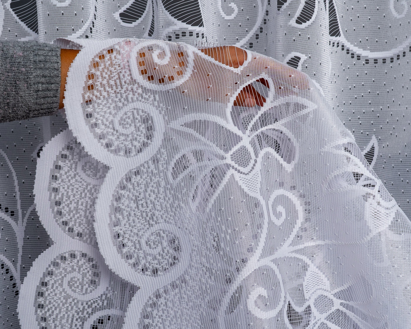 Красива жакардова штора, висота 160 см. Він красивий білий і має товстий візерунок. Виготовлена з високоякісної жаккардової пряжі. Густий, естетичний візерунок – ефектне оформлення вікна. Найкраще штора виглядає в плісе в пропорції 1:2. Після прання не потребує прасування