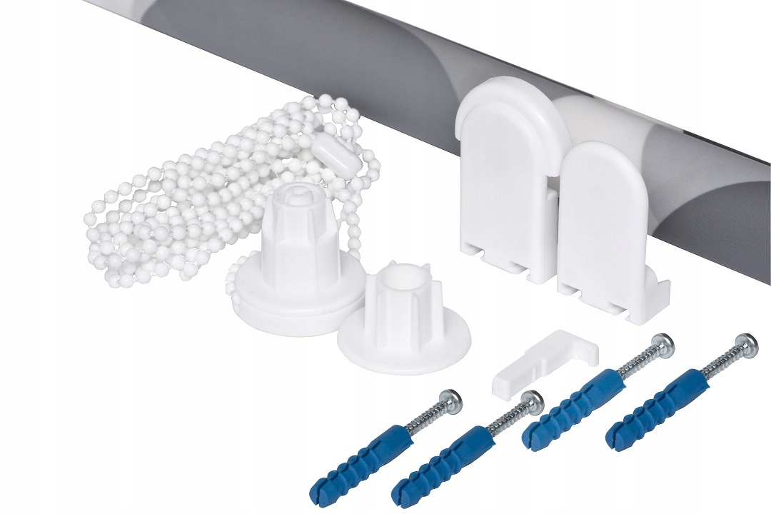 Ролетна штора кріпиться до стелі за допомогою пластикових ручок, в комплект входить ролетна штора, намотана на алюмінієву трубу, ручки для кріплення до стелі, система опускання з гальмом і ланцюгом, кріпильні шпильки. p>