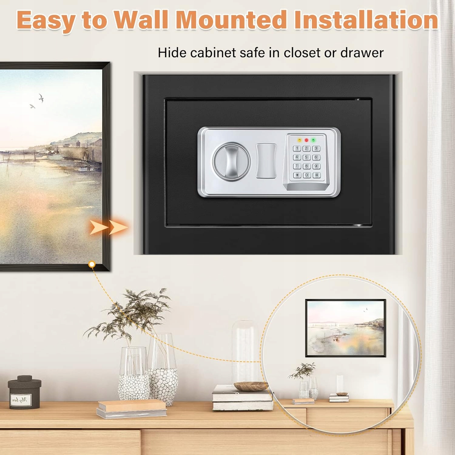 Установка на стіні: цей сейф стіни попередньо оброблений отвори ззаду (використовуючи 4 стандартні гвинти розширення), завдяки якому на стіні легко встановити стіну. Знімна полиця полегшує розміщення цінностей, якщо це необхідно. Сейф оснащений інтелектуальною лампою з датчиком доступу вночі. Встановлення сейфу може підвищити безпеку цінних предметів