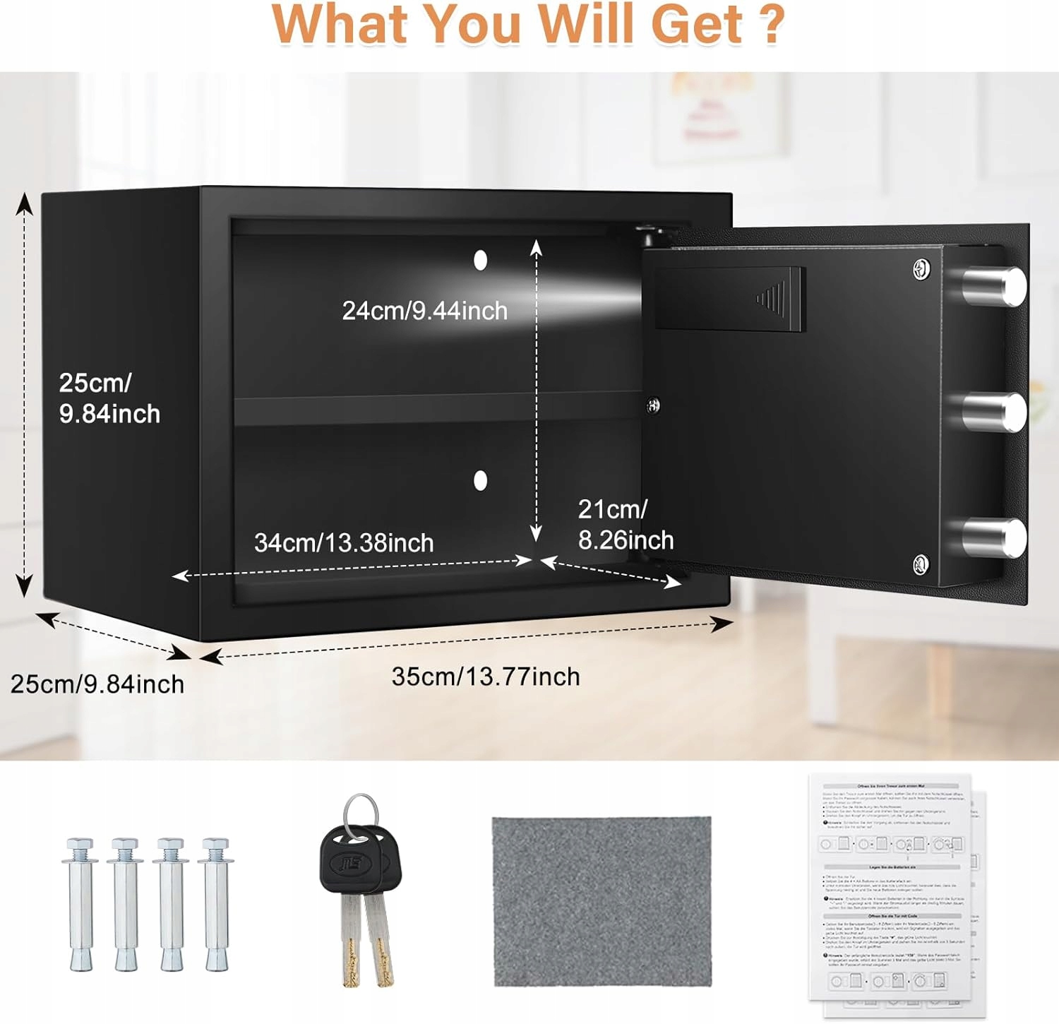 Система сигналізації та тихий режим: 3 рази поспіль вводиться неправильний пароль, а безпечний викидає попереджувальний звук протягом 20 секунд. Під час попереджувального звуку клавіатура вимкнена. Цифрові сейфи чудово підходять для захисту цінних предметів та конфіденційності. Ви можете натиснути "633", щоб вимкнути звук і "66", щоб увімкнути звук. Ви можете надати безпеці своїм друзям, батькам та близьким. Примітка. Не залишайте аварійний ключ у сейфі. Основний/особистий пароль та кнопка. Номери паролів можна встановити на максимум 8 цифр, що обмежує випадковий доступ, здогадуючись про цікавість