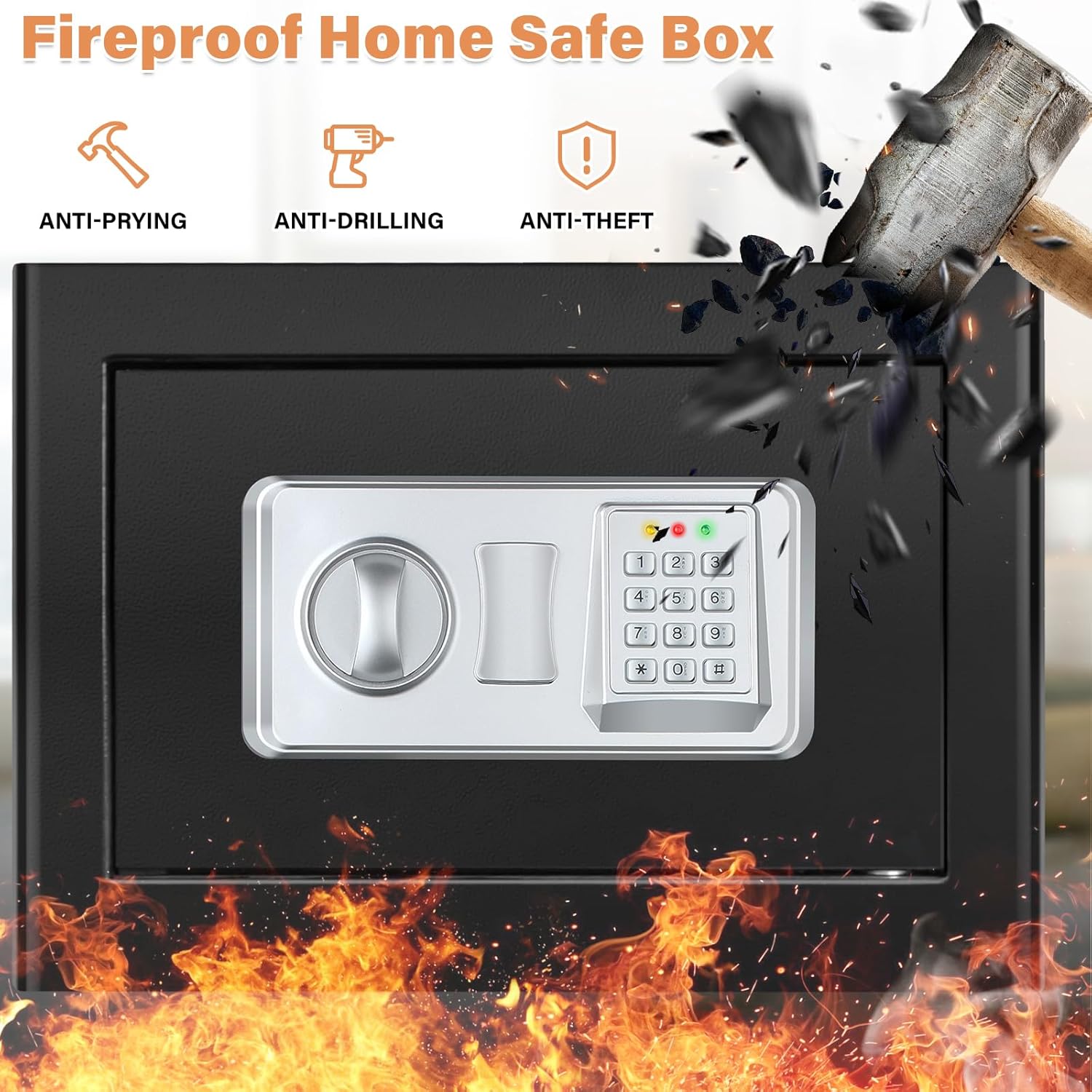 безпечний та вогневий пакет За гроші для дому: сейф виготовлений з міцної холодної сталі з хорошою стійкістю до підриву, буріння та високих температур. Меблі сейф оснащений трьома 22 -мм болтами та 46 мм вхідних дверей. Ви можете використовувати Safe для зберігання готівки, прикрас, ліків, подалі від цікавих дітей чи злодіїв. У нашій пропозиції ви також знайдете вогнезахисний, водонепроникний пакет для грошей та килимок, який додатково захистить ваші цінні речі
