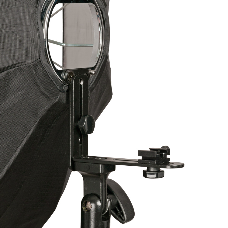 Опція швидкого розкладання дозволяє розкласти всю конструкцію та швидко встановити світильник за короткий час. Монтажний кронштейн софтбокс дозволяє адаптувати його до всіх типів ламп. Рухомі елементи дозволяють регулювати відстань отвору від конфорки і регулювати його висоту відносно лампи. Міцний монтажний куб дозволить надійно зафіксувати саму лампу та лампу з додатковими аксесуарами: кубом синхронізації, фотоелементом, радіотригером.