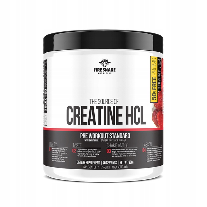 FireSnake Creatine HCL - це препарат, що містить висококонцентровану форму креатину, яка не вимагає великих доз або фази навантаження.