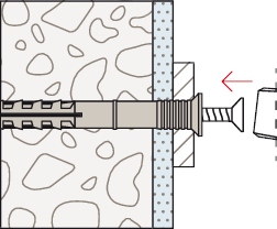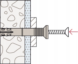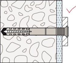 Забивний гвинт Hammerfix N підходить для наскрізного встановлення. При забиванні шуруп штовхає дюбель у двох напрямках, створюючи міцний анкер у будівельному матеріалі. Для монтажу в дерев’яні конструкції рекомендується використовувати дюбелі з потайною головкою; для металевих конструкцій використовуйте дюбелі з плоскою головкою, а для довгих отворів – дюбелі з куполоподібною головкою.