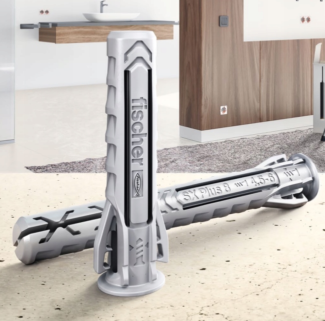 Завдяки своєму 4-сторонньому розширенню дюбель fischer SX Plus є спеціалістом для кріплення в твердих будівельних матеріалах, таких як бетон, силікатна цегла та кладка. Спеціальні кріпильні крила забезпечують попередню фіксацію шурупа, що означає, що його не потрібно додатково утримувати при установці в стелю. Це гвинтове кріплення дозволяє користувачеві здійснювати гнучкий і зручний процес вставлення. Спеціально розроблений край дюбеля також запобігає ковзанню дюбеля глибше в просвердлений отвір, забезпечуючи безпечне встановлення. Високоякісний нейлон, з якого виготовлена заглушка, гарантує постійну фіксацію в широкому діапазоні твердих і перфорованих будівельних матеріалів.