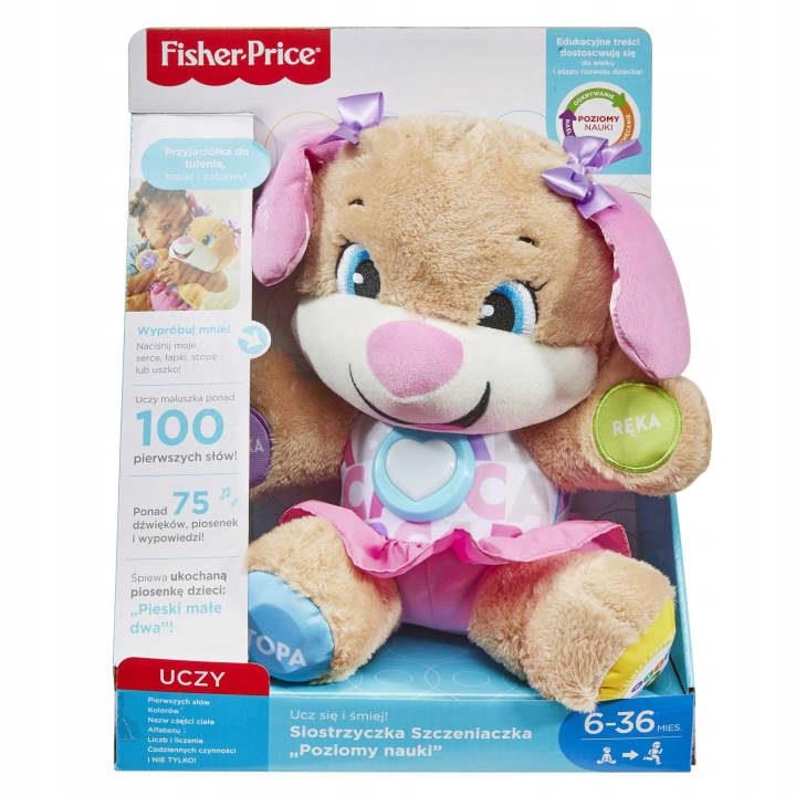 Настав час познайомитися з прекрасною сестрою-цуценям від Fisher Price! Тепер чарівна героїня виглядає ще красивіше! Її рожеві вушка прикрашені бантами, а її рожево-біла сукня з літерним мотивом змусить кожну дівчину зачарувати своїм новим талісманом! Вона ідеальна подруга, подруга-подушка, а також чудовий вчитель! Діти вчаться швидше, коли навчання приносить задоволення. Співайте та вивчайте нові слова разом із милою сестричкою.