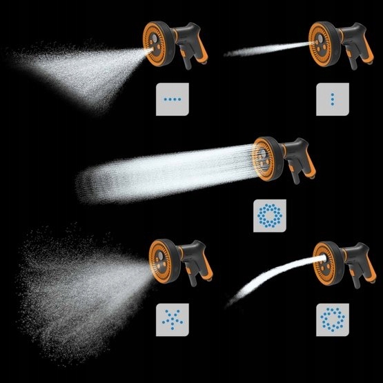 П’ять моделей розпилення головки можна регулювати м’яким рухом, а передній регулятор увімкнення/вимкнення, що замикається, можна використовувати для постійного регулювання потоку. Крім того, головка та ручка можуть при необхідності можна замінити на інші засоби для поливу Fiskars; Завдяки універсальному розміру він також підходить для інших брендів засобів для гідратації.