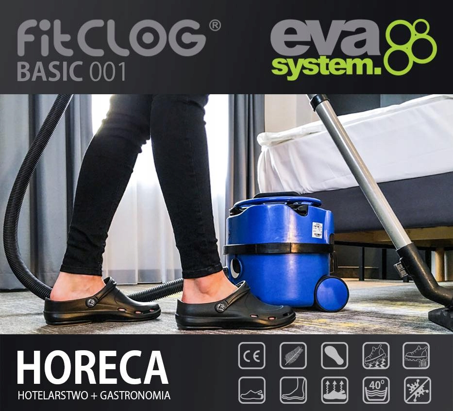 Лінійка FitClog Basic, виготовлена з надлегкого матеріалу EVA, робить шльопанці дуже зручними та забезпечує безпрецедентний комфорт використання. Протиковзка підошва забезпечує високе зчеплення навіть на жирних і мокрих поверхнях, оскільки FitClog Basic має підошву з гуми, що значно підвищує безпеку використання на різних поверхнях. Для підвищення комфорту використання взуття оснащене підкладкою гарної форми з антибактеріальними та антиперспірантними властивостями. Лабораторні дослідження підтвердили, що футеровка не містить ароматичних амінів, формальдегіду та діаметилфумарату. Пошкоджену (зношену) накладку необхідно замінити на нову. Спеціальний п’ятковий ремінь утримує взуття в правильному положенні, а більш високий каблук забезпечує кращу стійкість. Вбудована передня частина взуття та відповідне розташування вентиляційних отворів захищають стопу від вологи зовнішніх факторів.