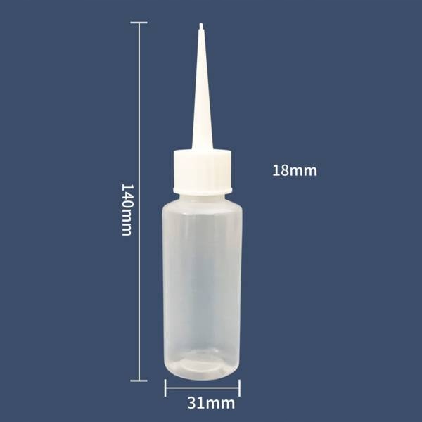 Пляшка об’ємом 50 мл із аплікатором, корисна в майстерні з електроніки чи виробнику моделей для зберігання та дозування різних типів масел, рідин і розчинів.